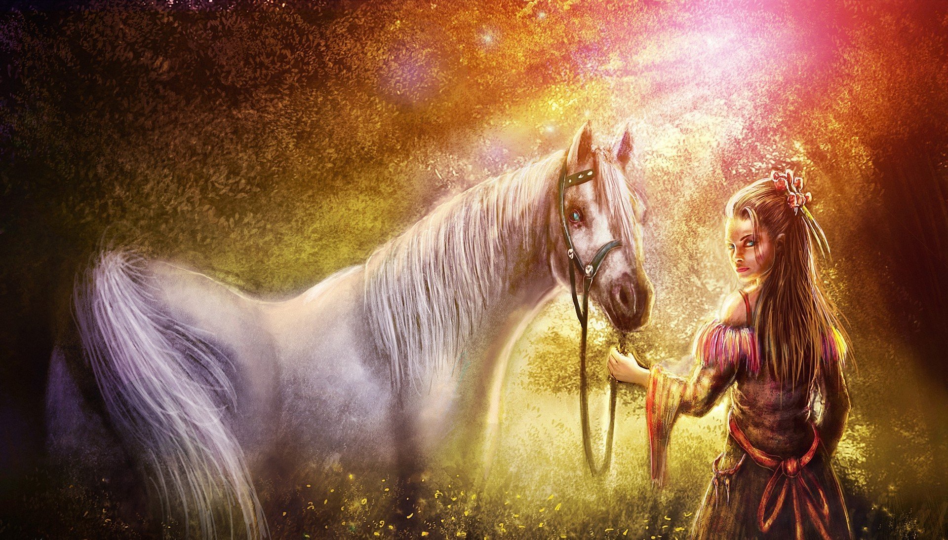 A beautiful girl with a horse in a fabulous forest