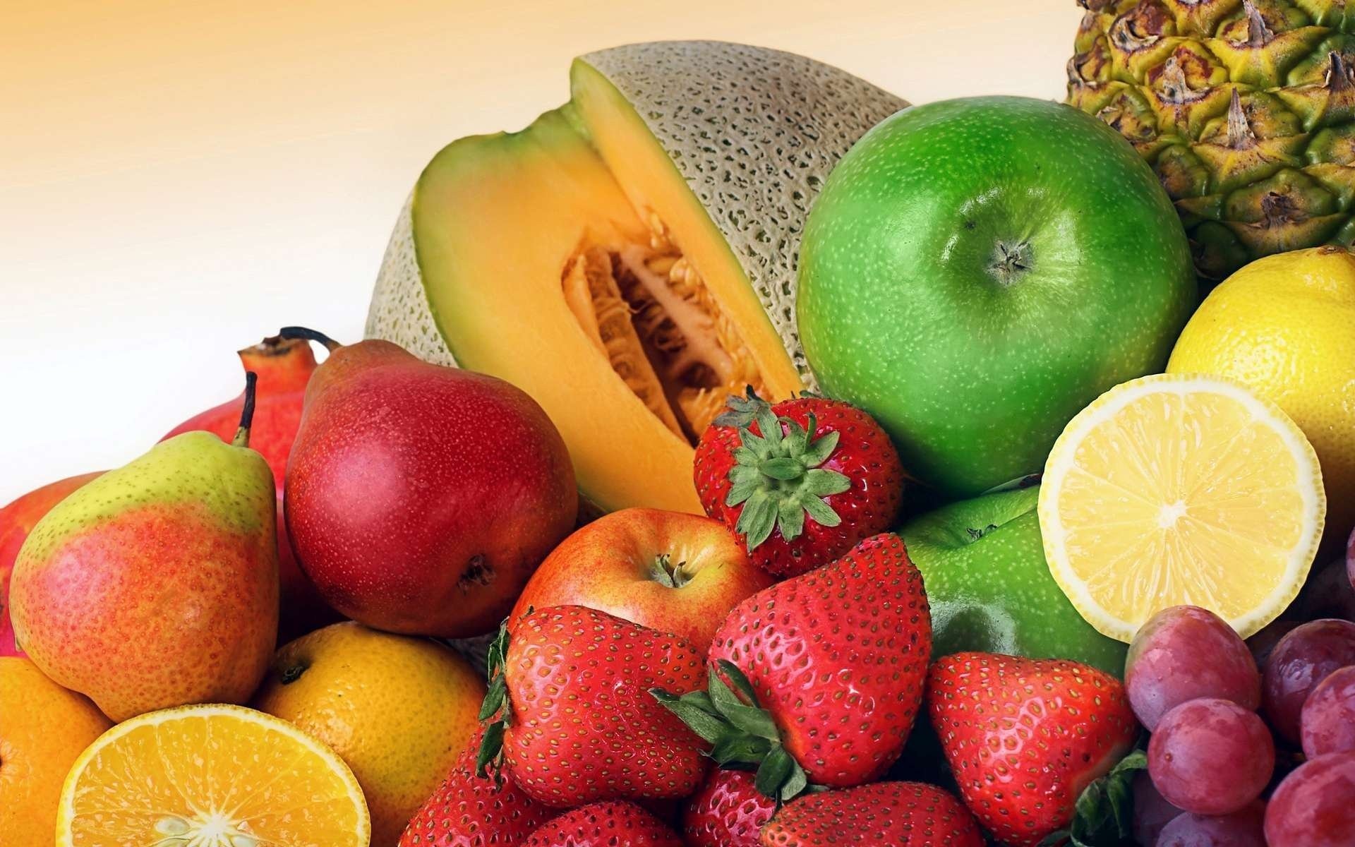 Assorted fruit: strawberries, lemon, grapes, pears, oranges, apples, passion fruit