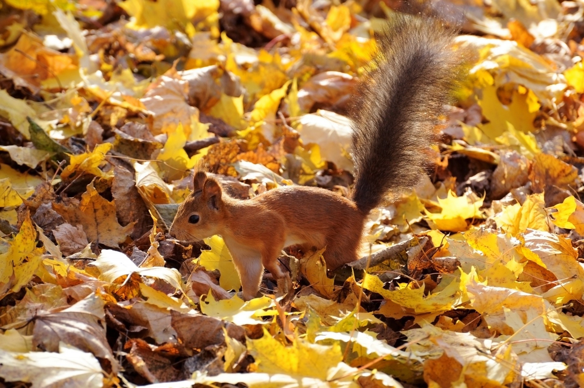 Squirrel with a fluffy tail in autumn foliage