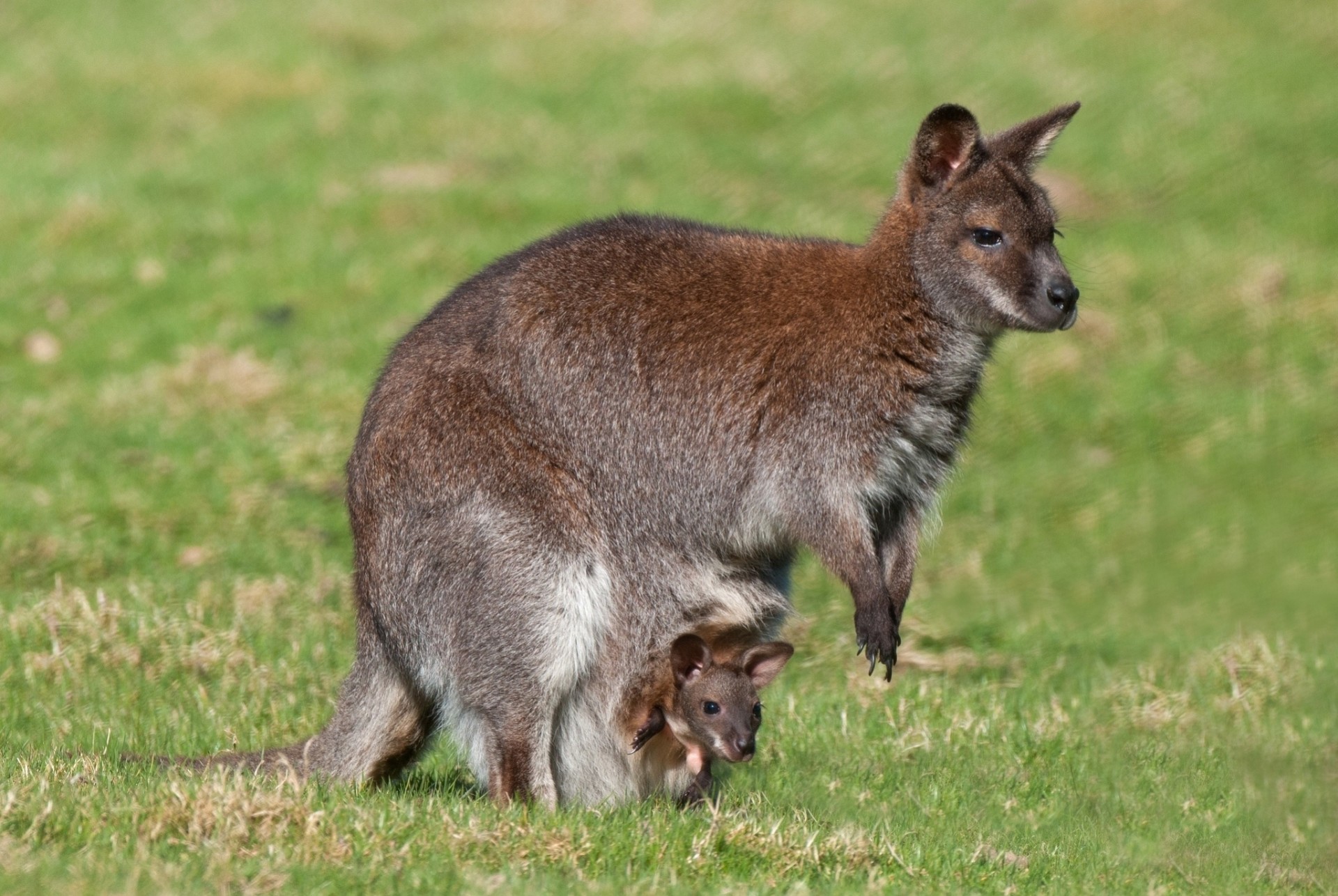 Kangaroo with cubs in a bag in the field