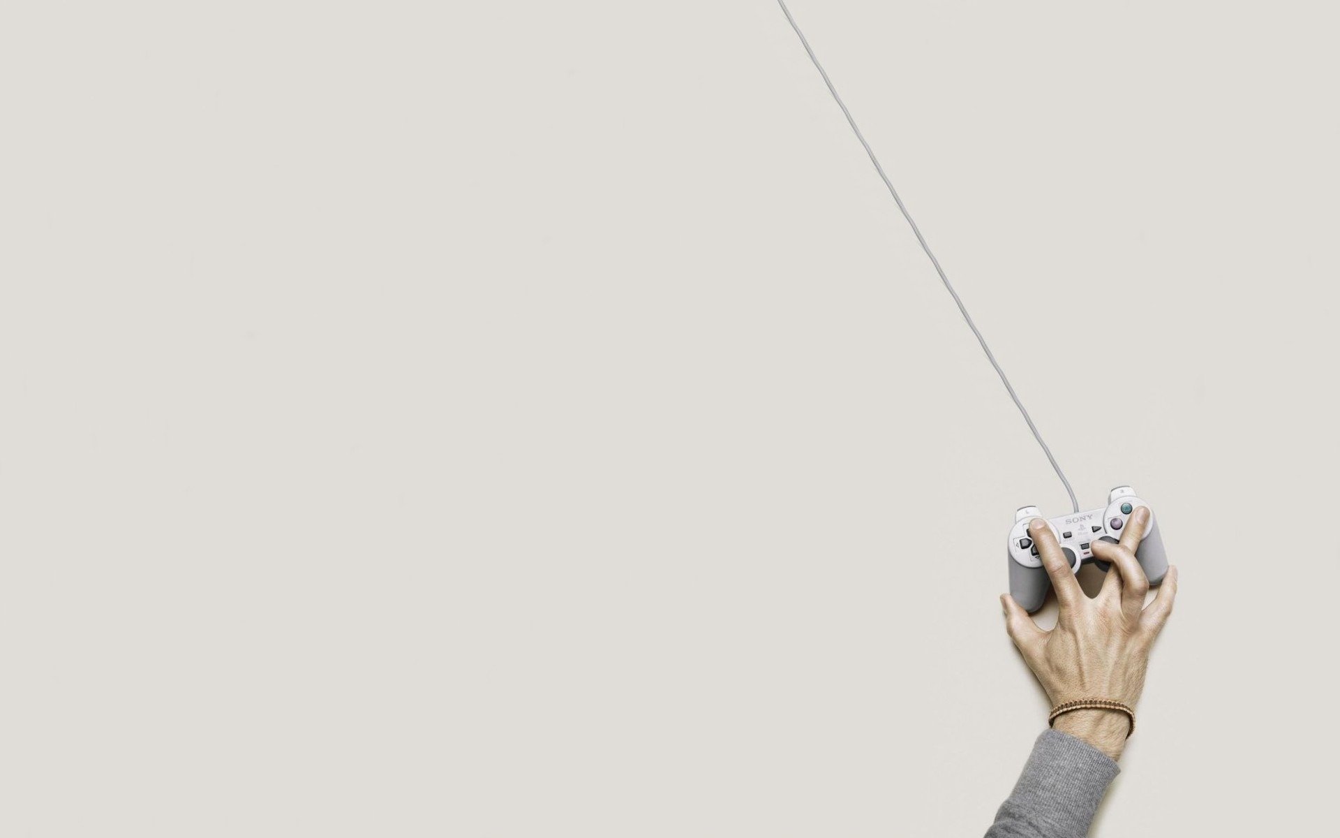 A hand with interlaced fingers on a joystick