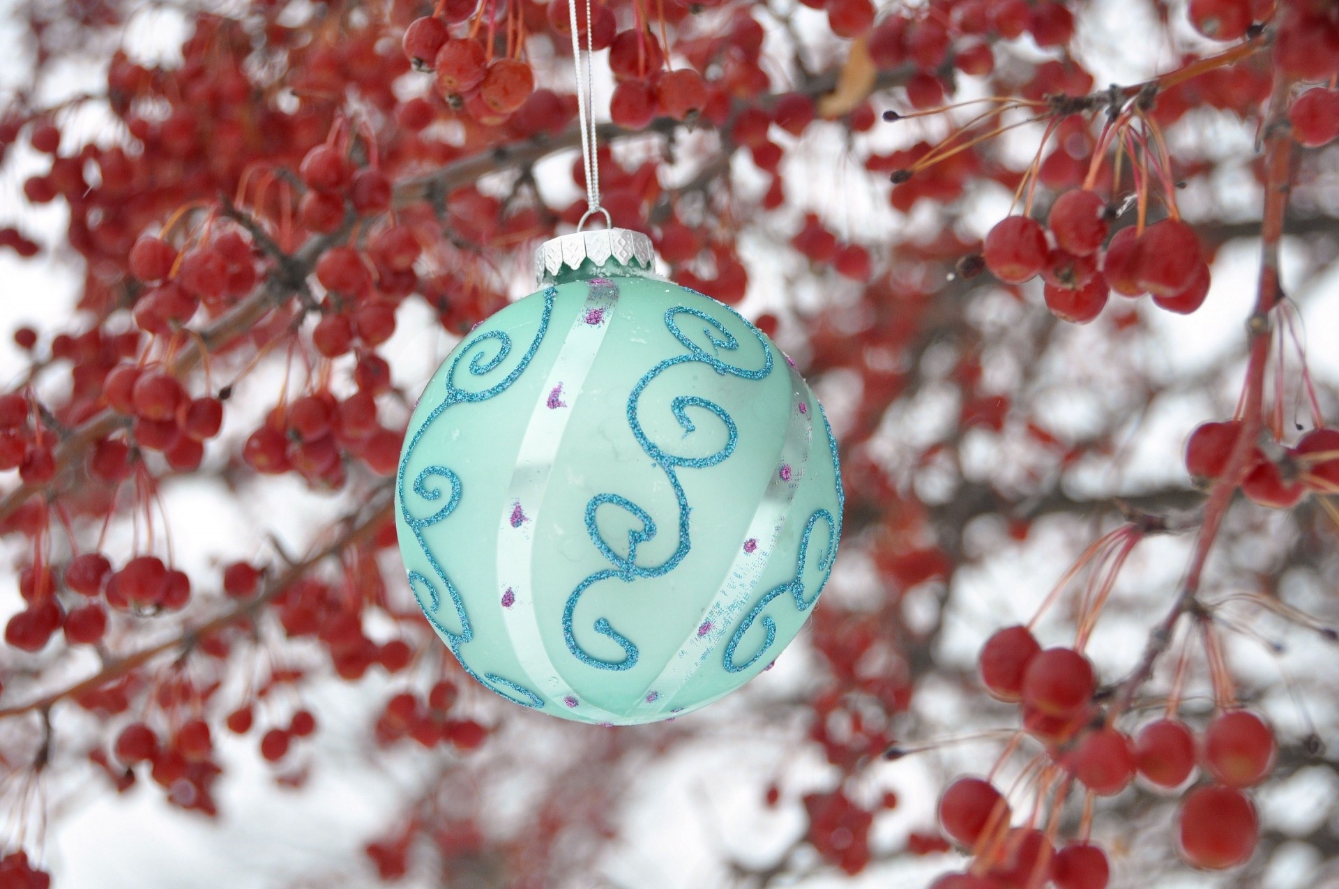 Turquoise Christmas ball with patterns hanging on white threads on the background of branches with small red apples in winter