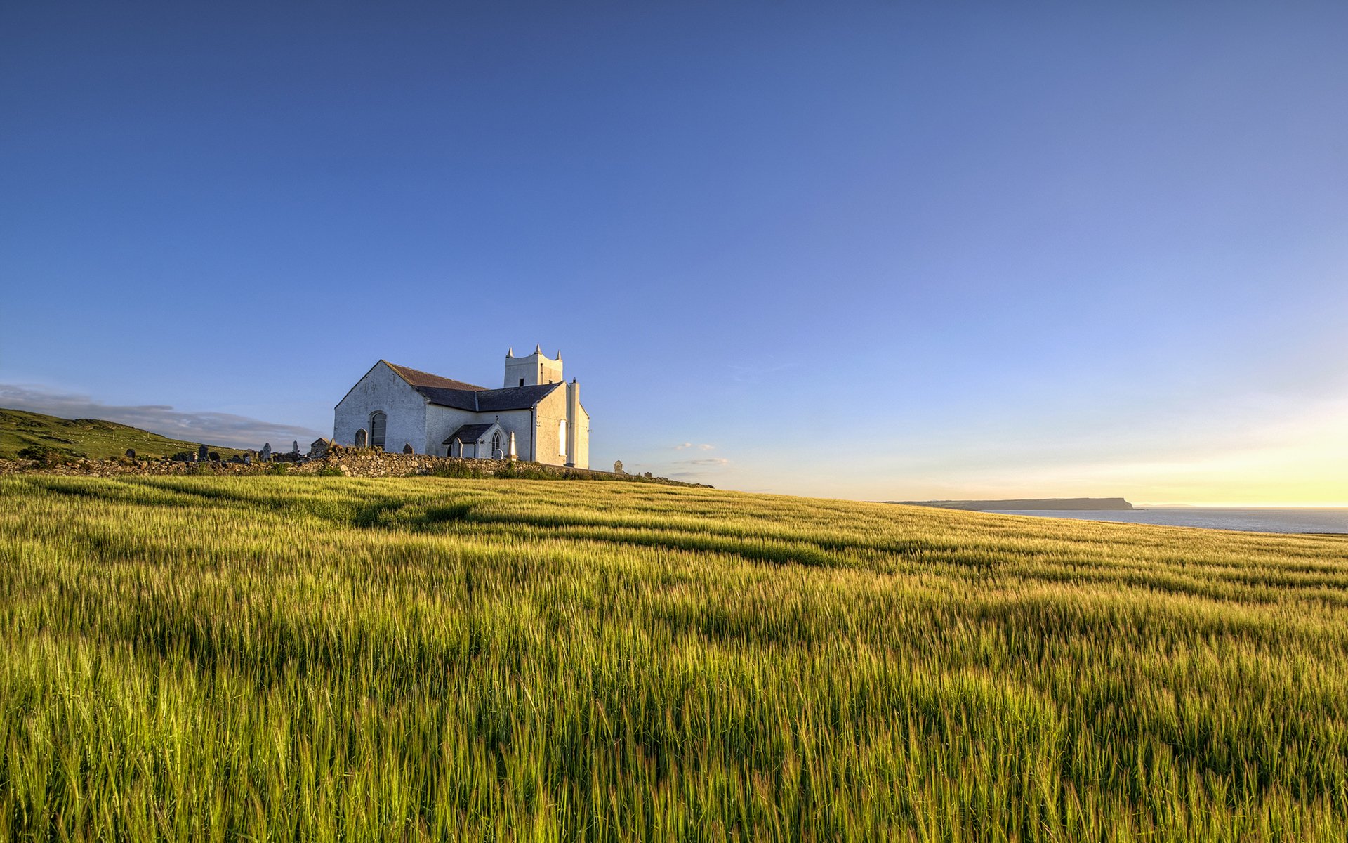 Parish church in the middle of a field on the Atlantic Ocean in Ireland