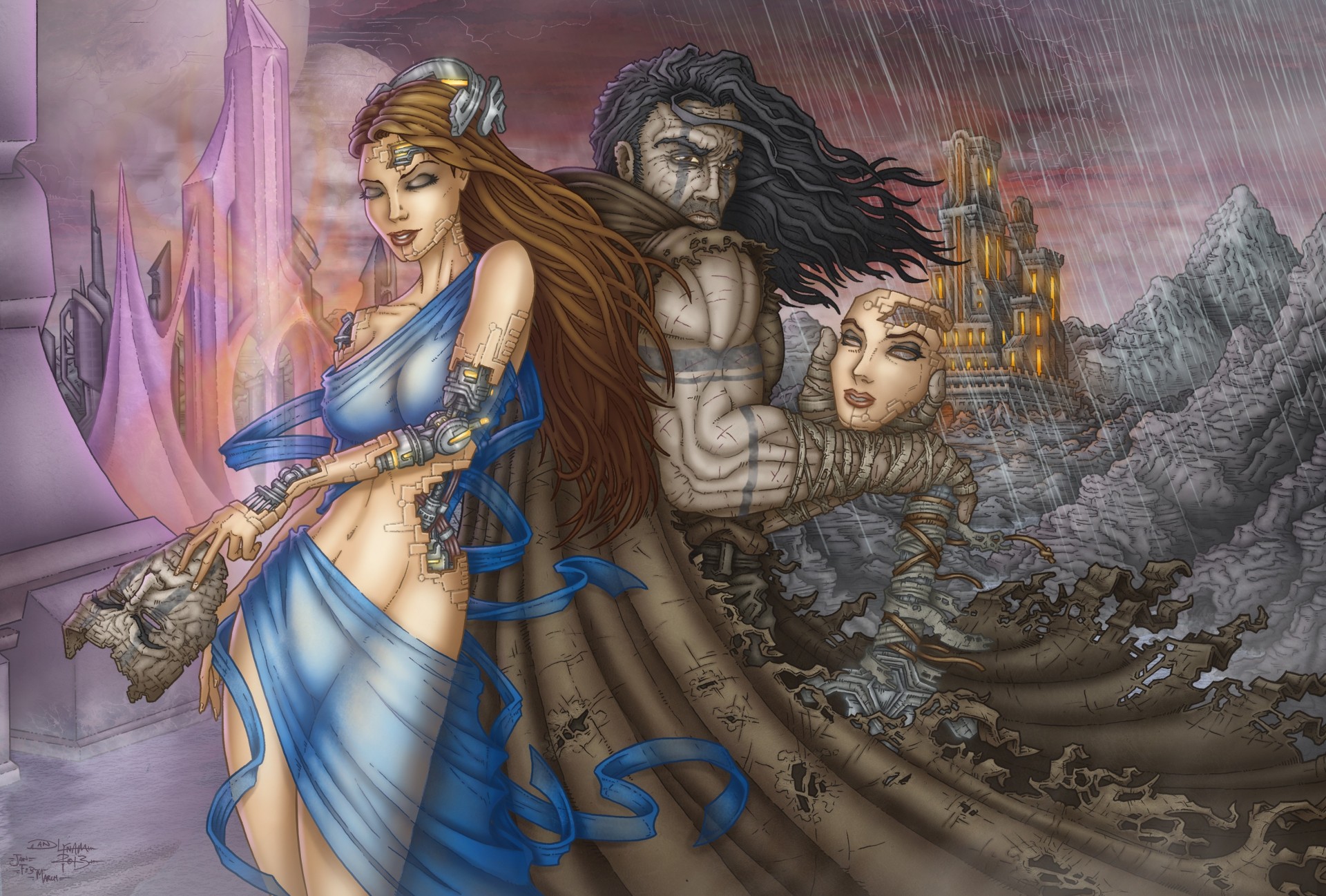 Image tags:bandages, man, girl, mask, robots, fiction, face, cyborg, rock