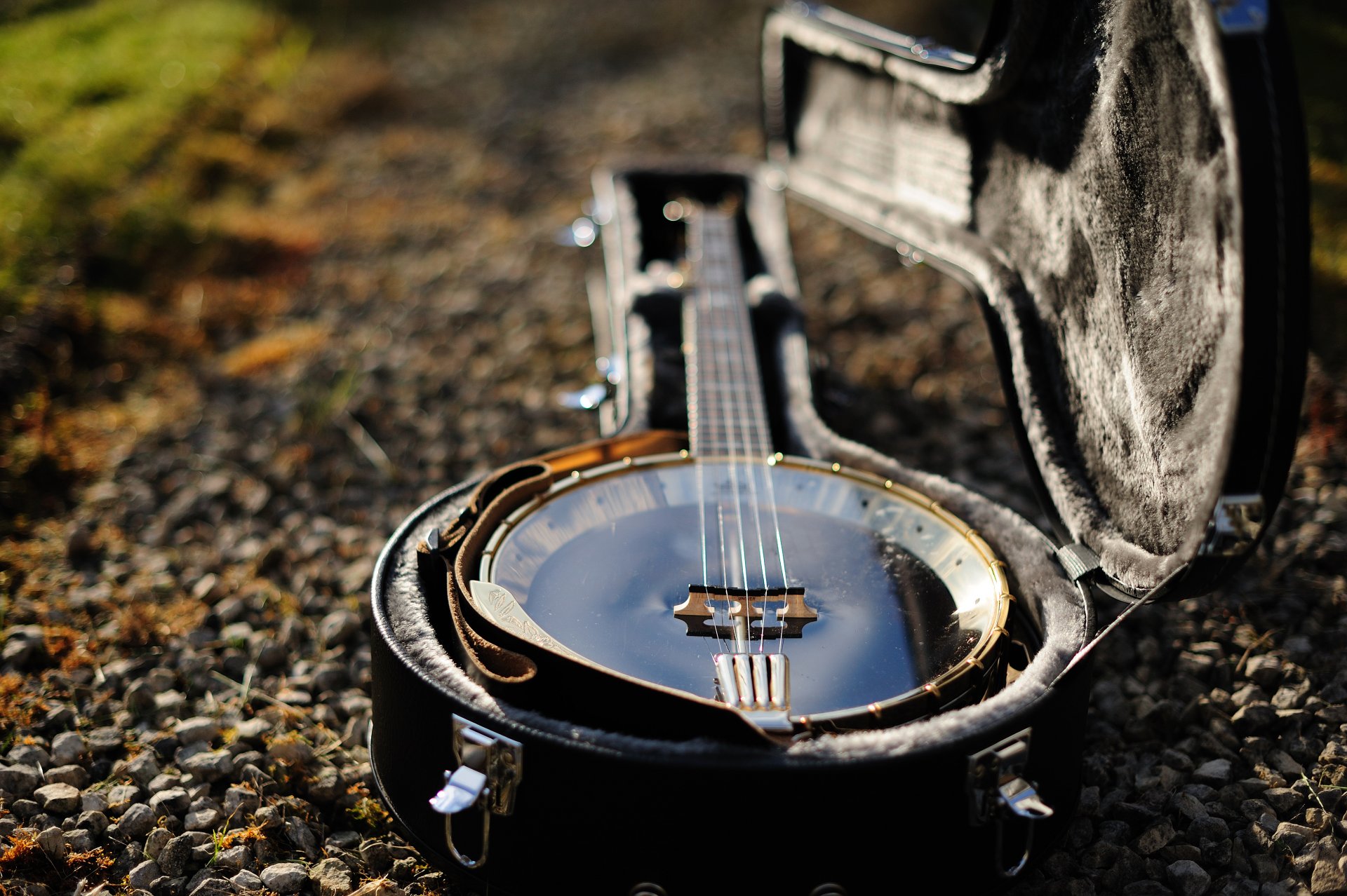 The banjo is in a case on the road