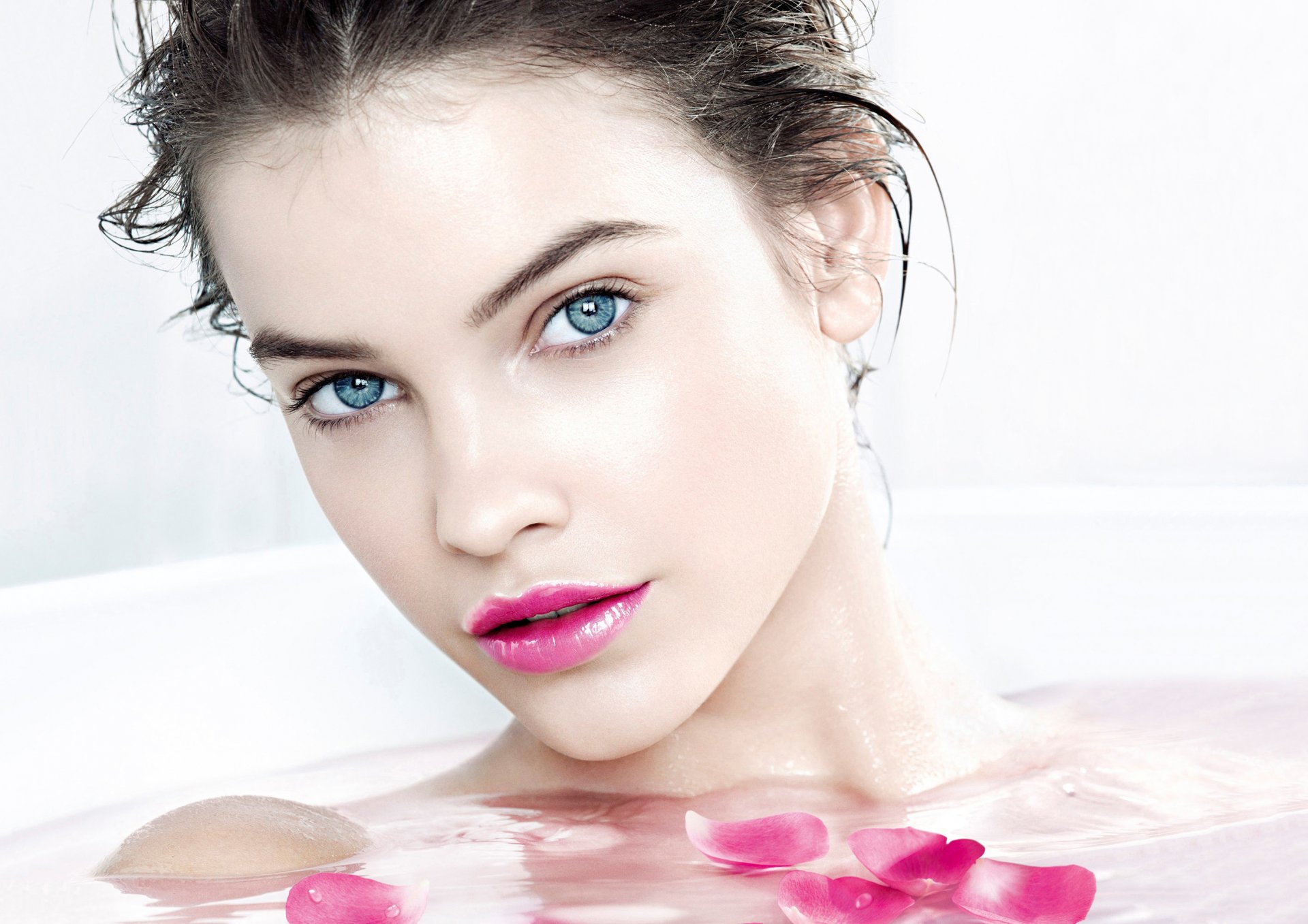 Image tags:barbara palvin, girl, model, victoria's secret angel, brown hair, face, lipstick, eyes, blue, petals, pink
