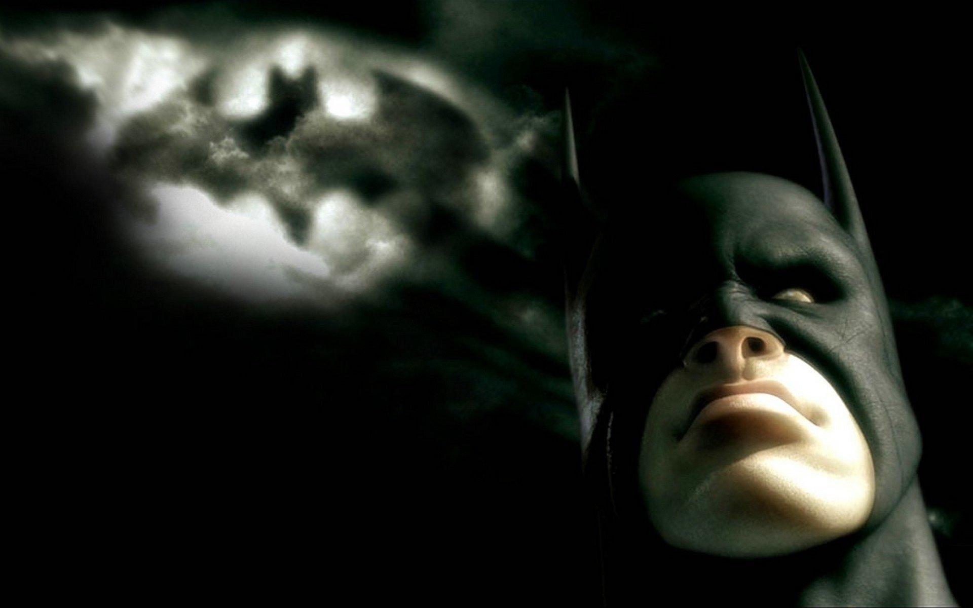 Batman on the background of his bat sign