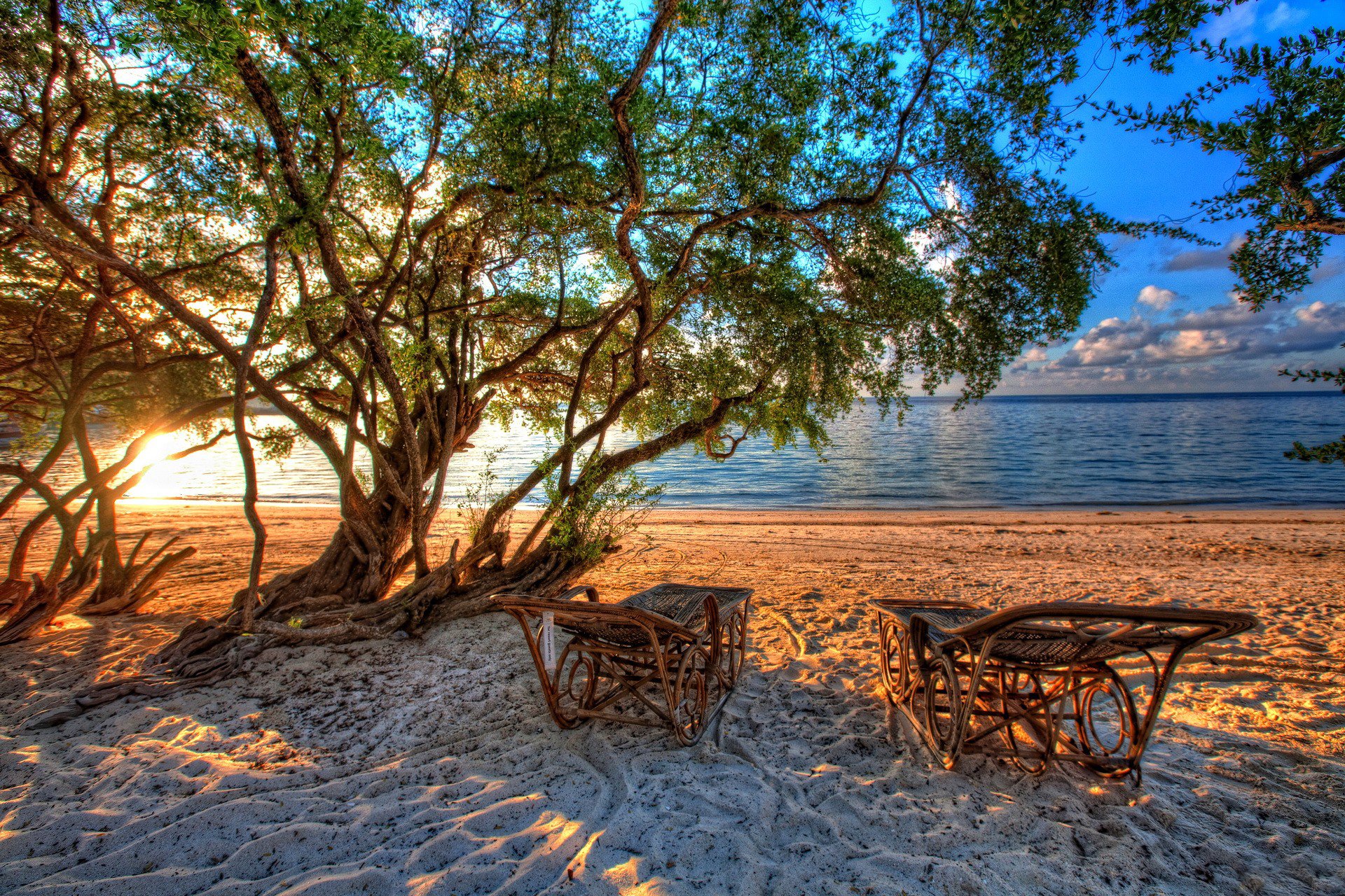 A pair of carved chaise lounges stand on a trampled sandy shore near a wicker tree and a river behind which the sun sets