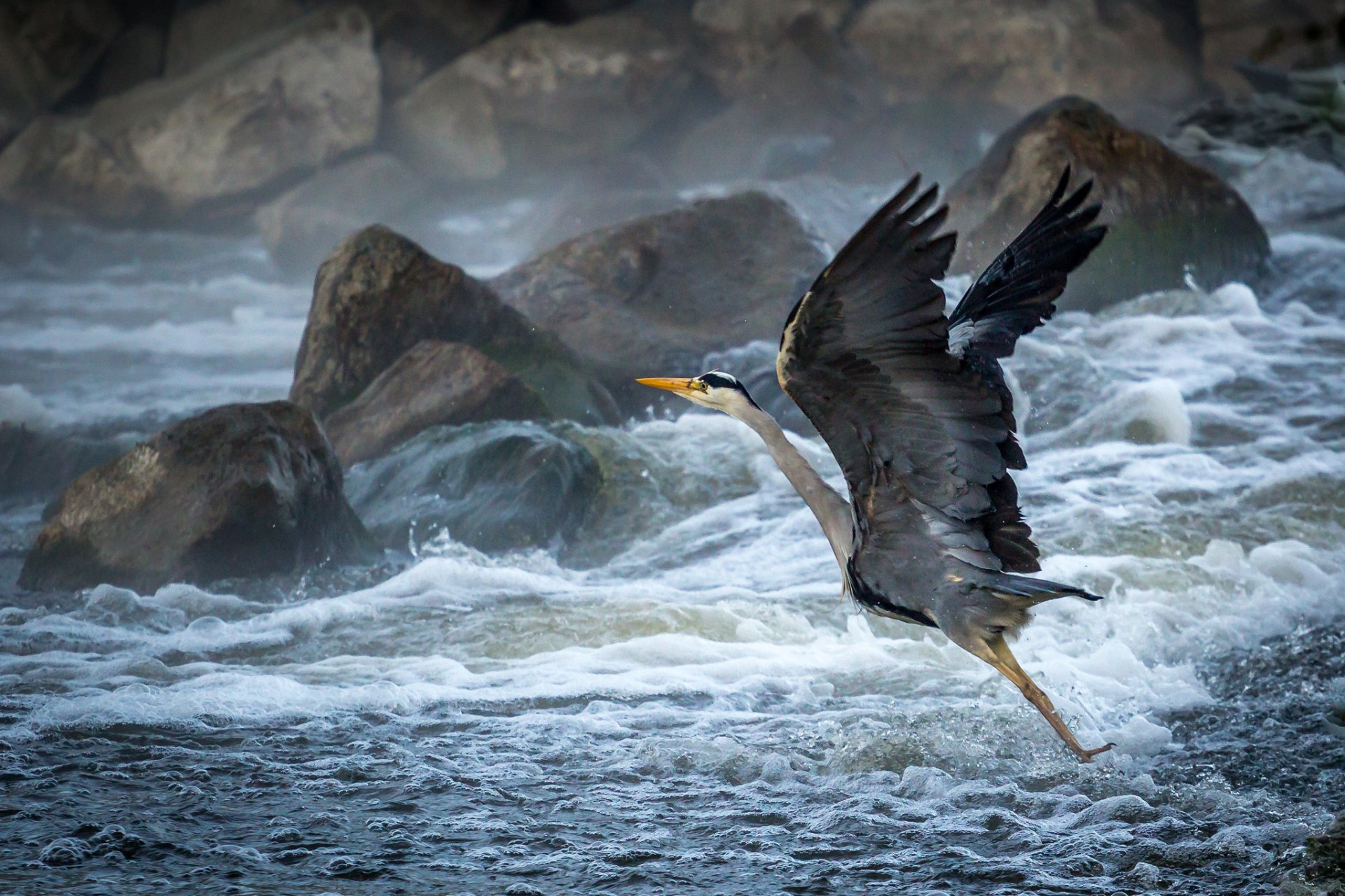 On a stone beach, a heron takes off over the waves