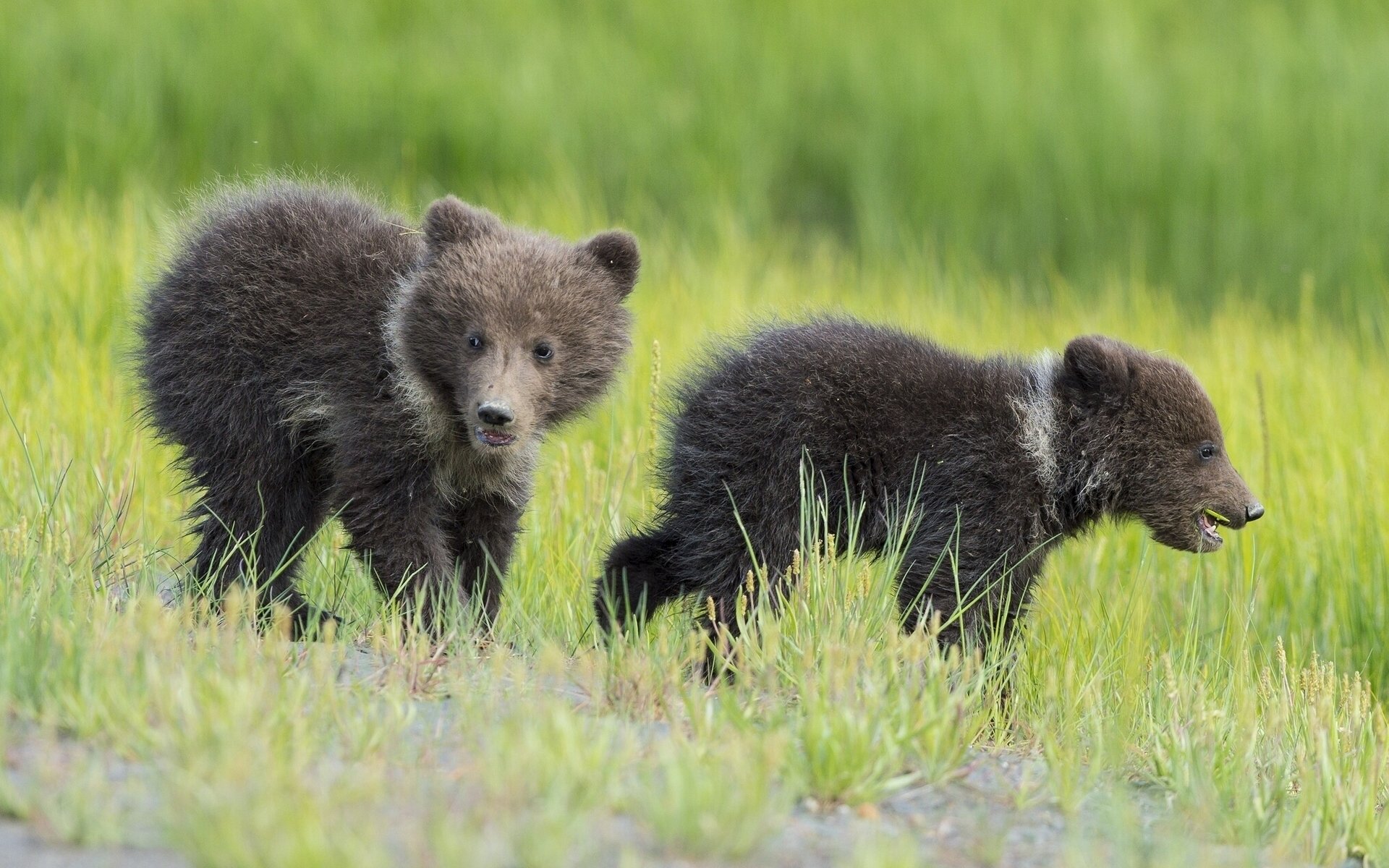 Two bear cubs walking on the grass