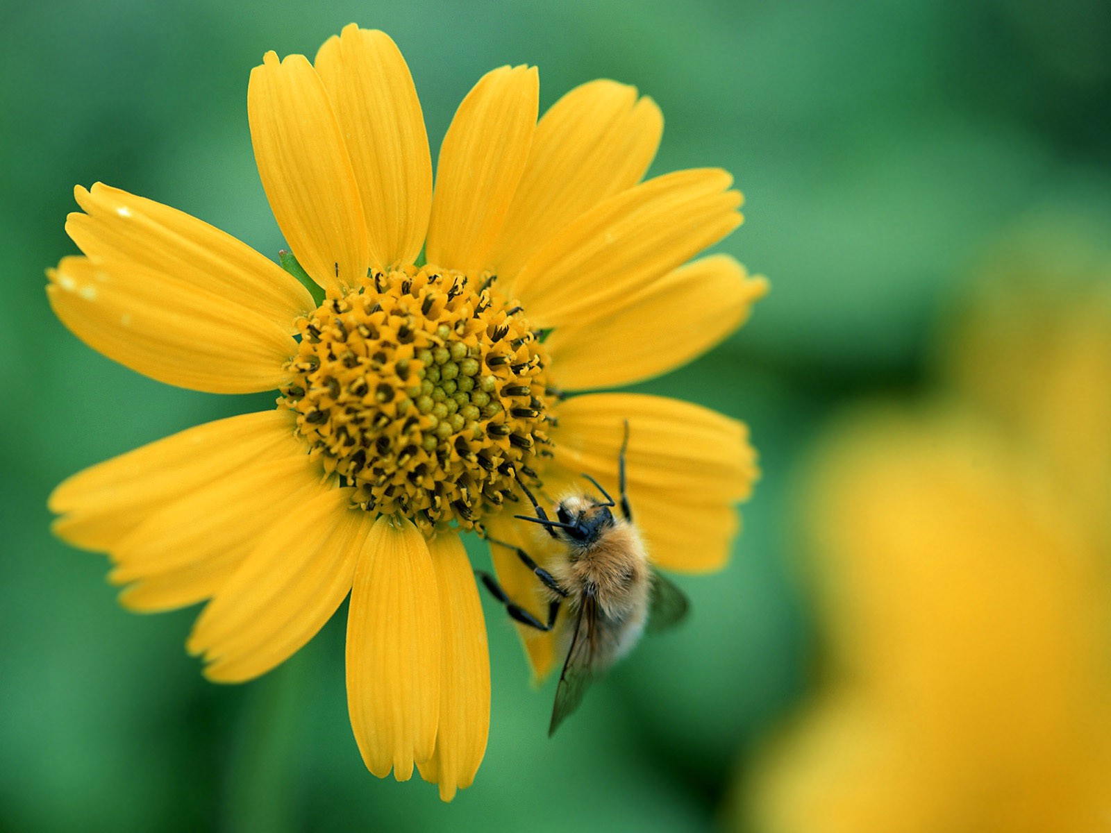 Collecting pollen on a yellow flower. A hardworking bee