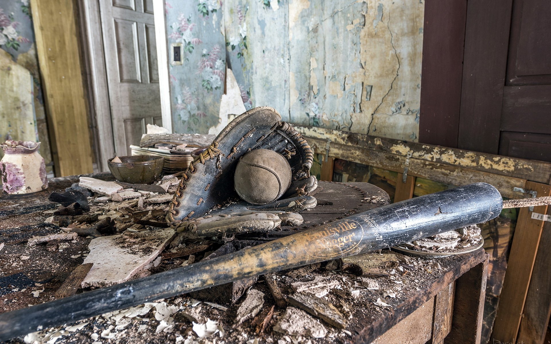 Baseball bat, glove and ball in a destroyed house