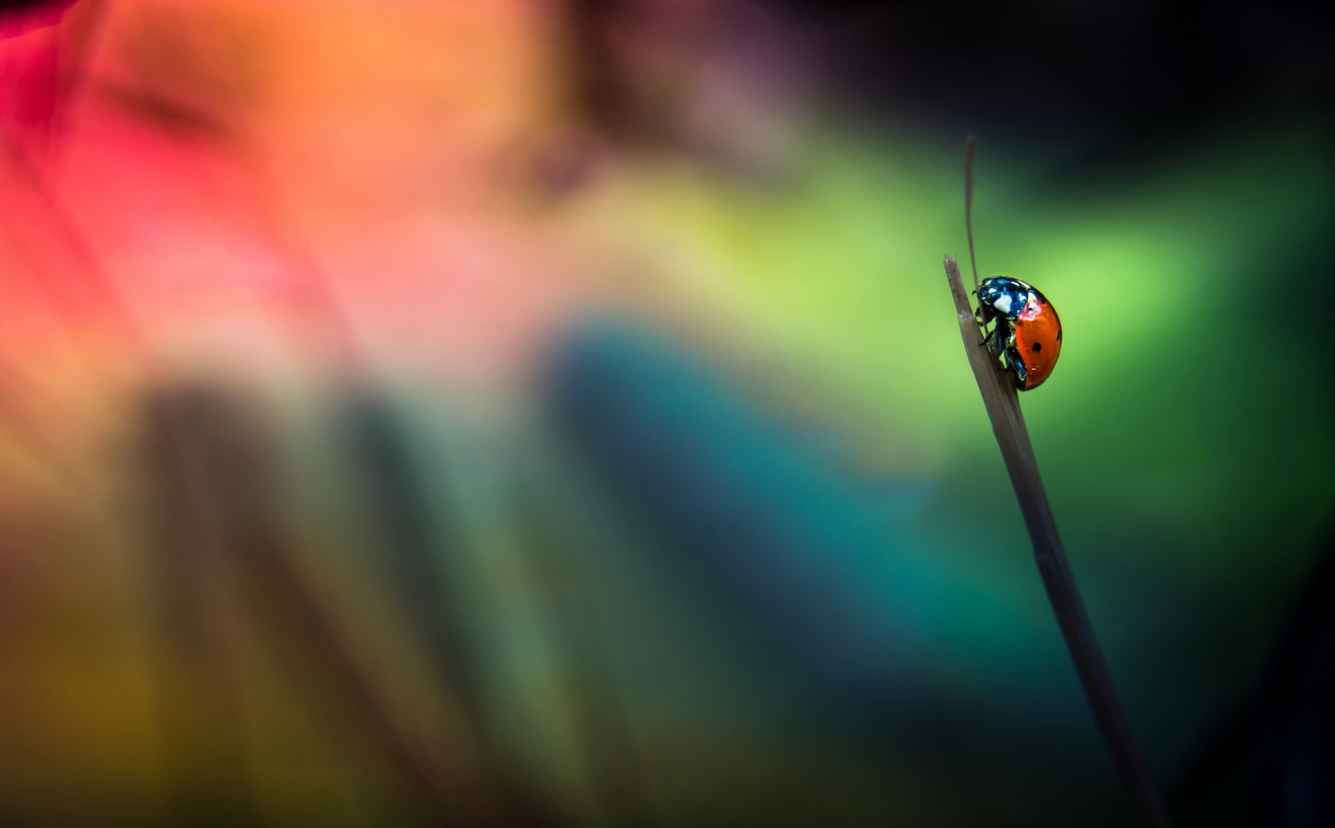 Preparation for the flight. Ladybug on a blade of grass. Memory of the rain