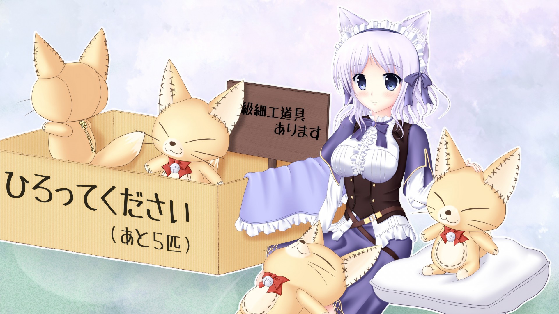 Image tags:blue eyes, short hair, tapes, headwear, blush, animals, catgirl, white hair, animal ears