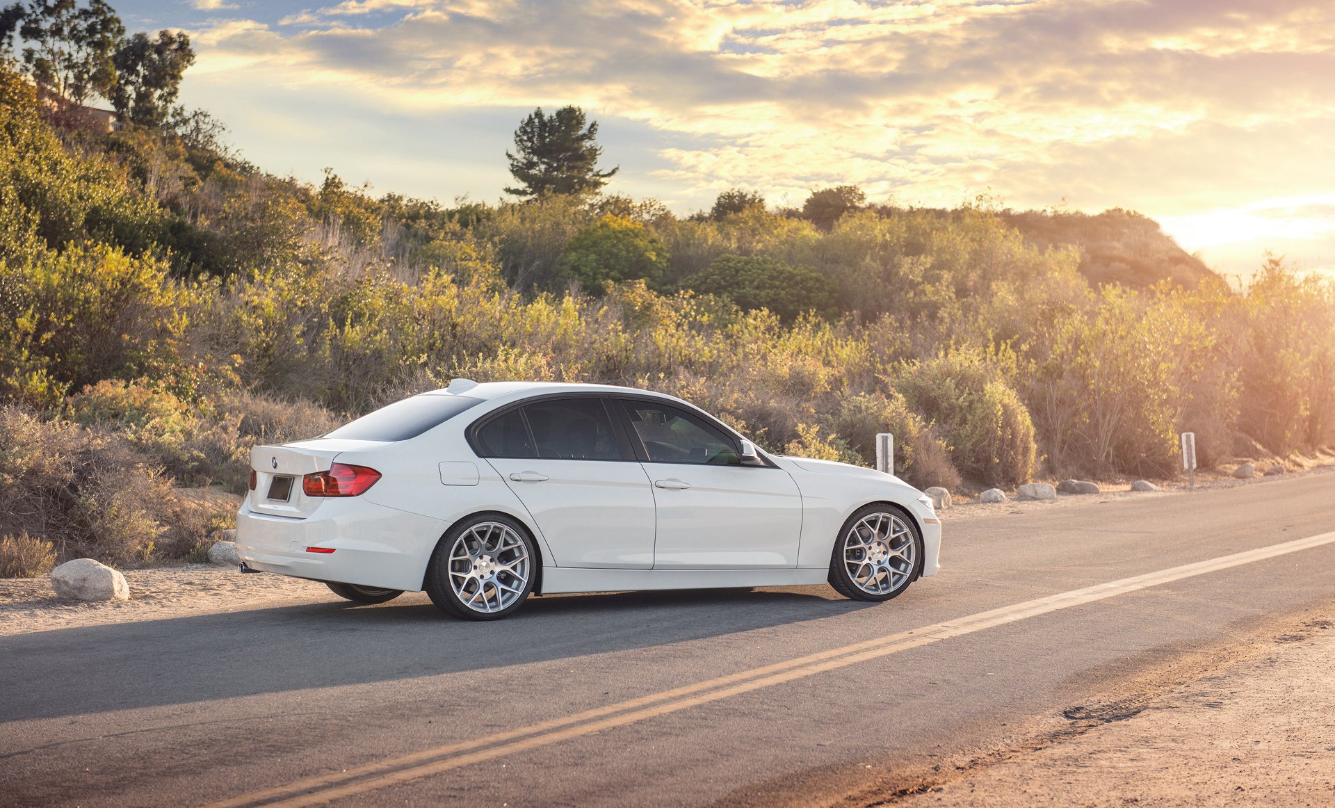 White BMW on the road among the hills
