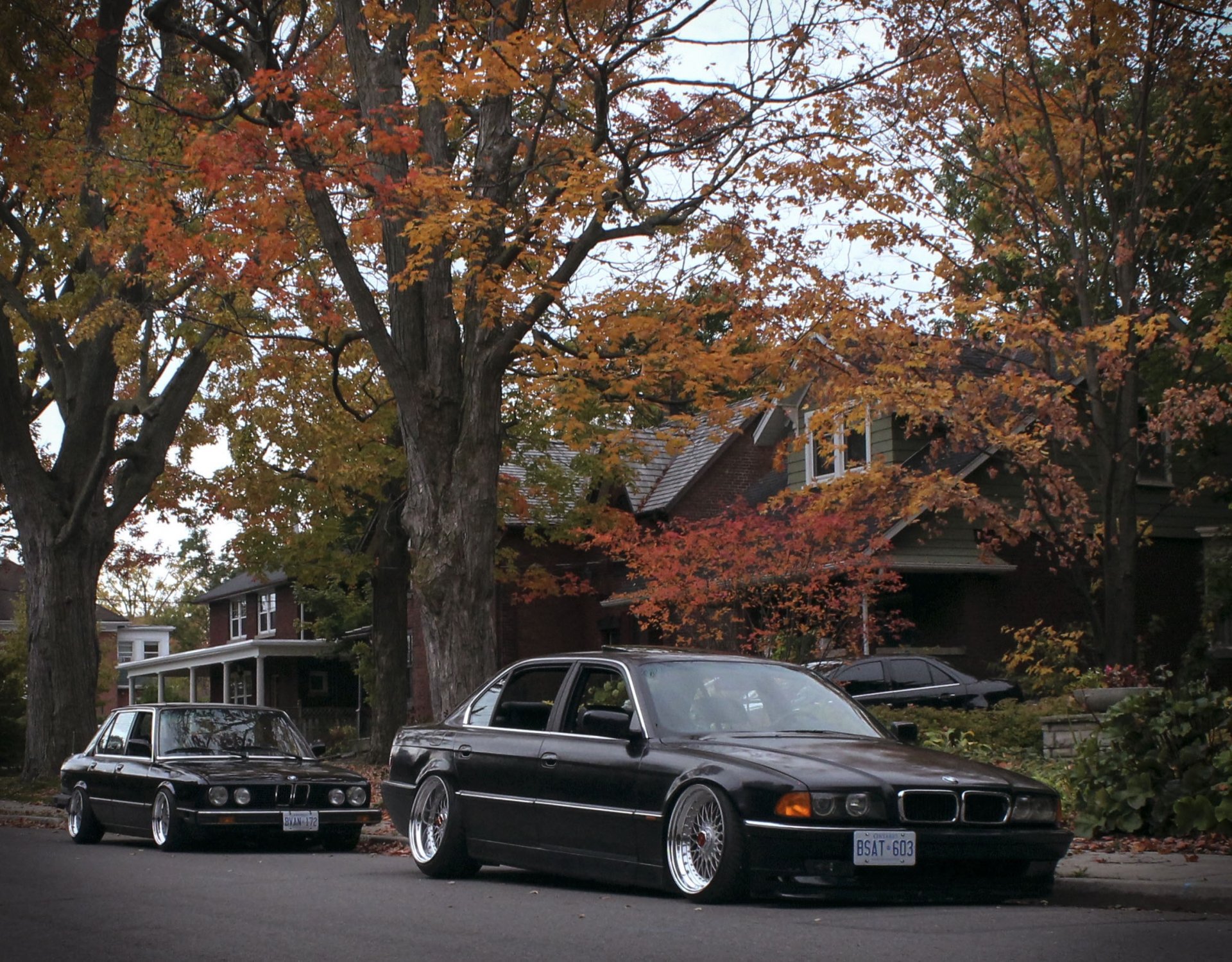 Two black cars on an autumn street