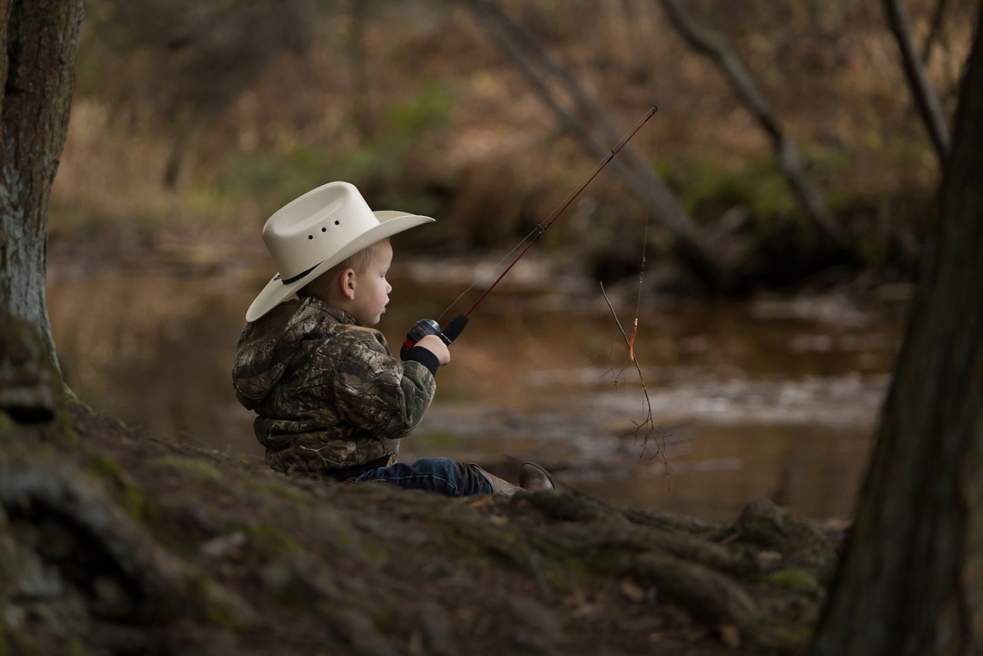 A kid in a hat with a fishing rod is sitting on the shore