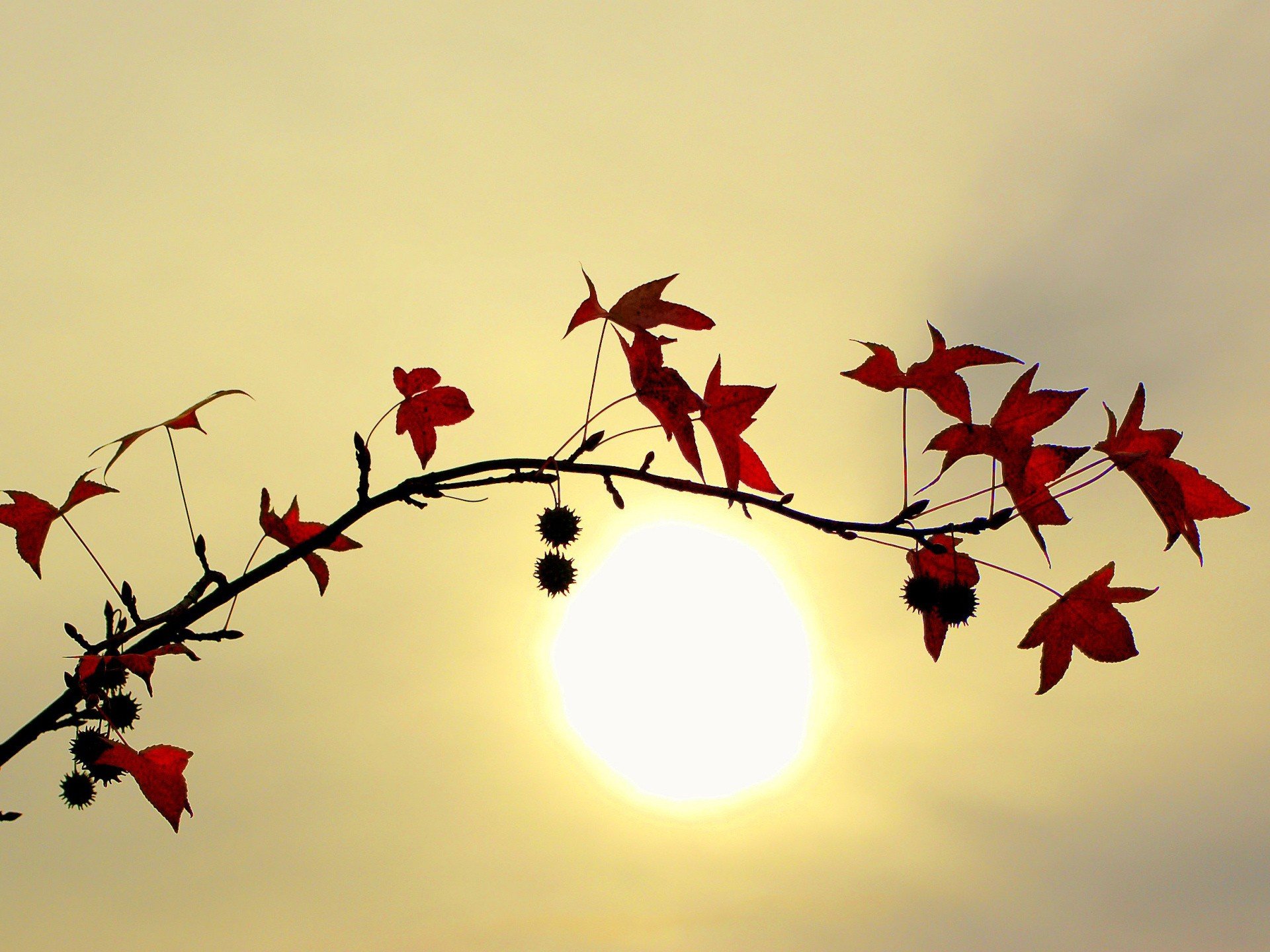 Red leaves on the background of the sun