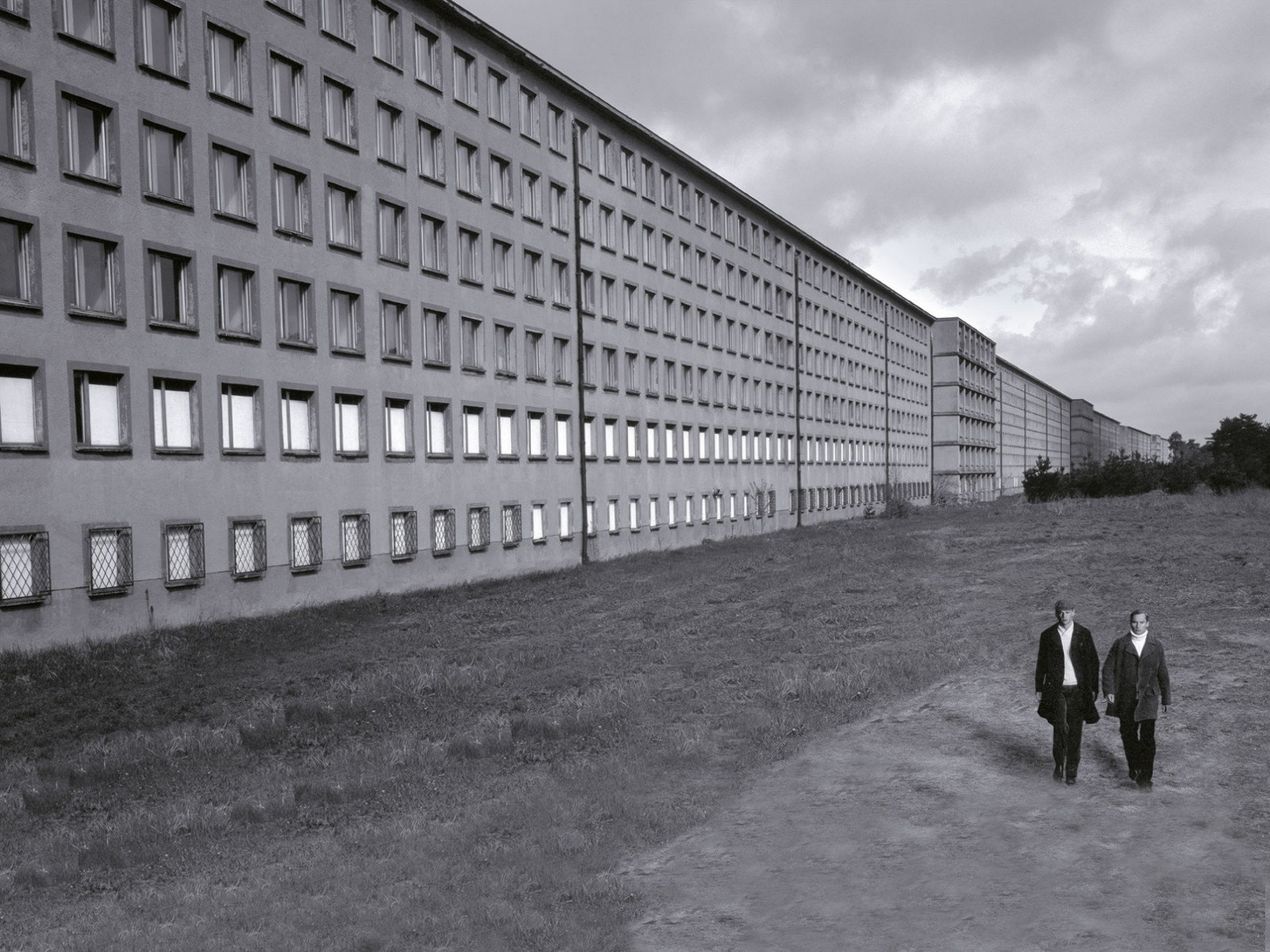 A long building with two people walking along it