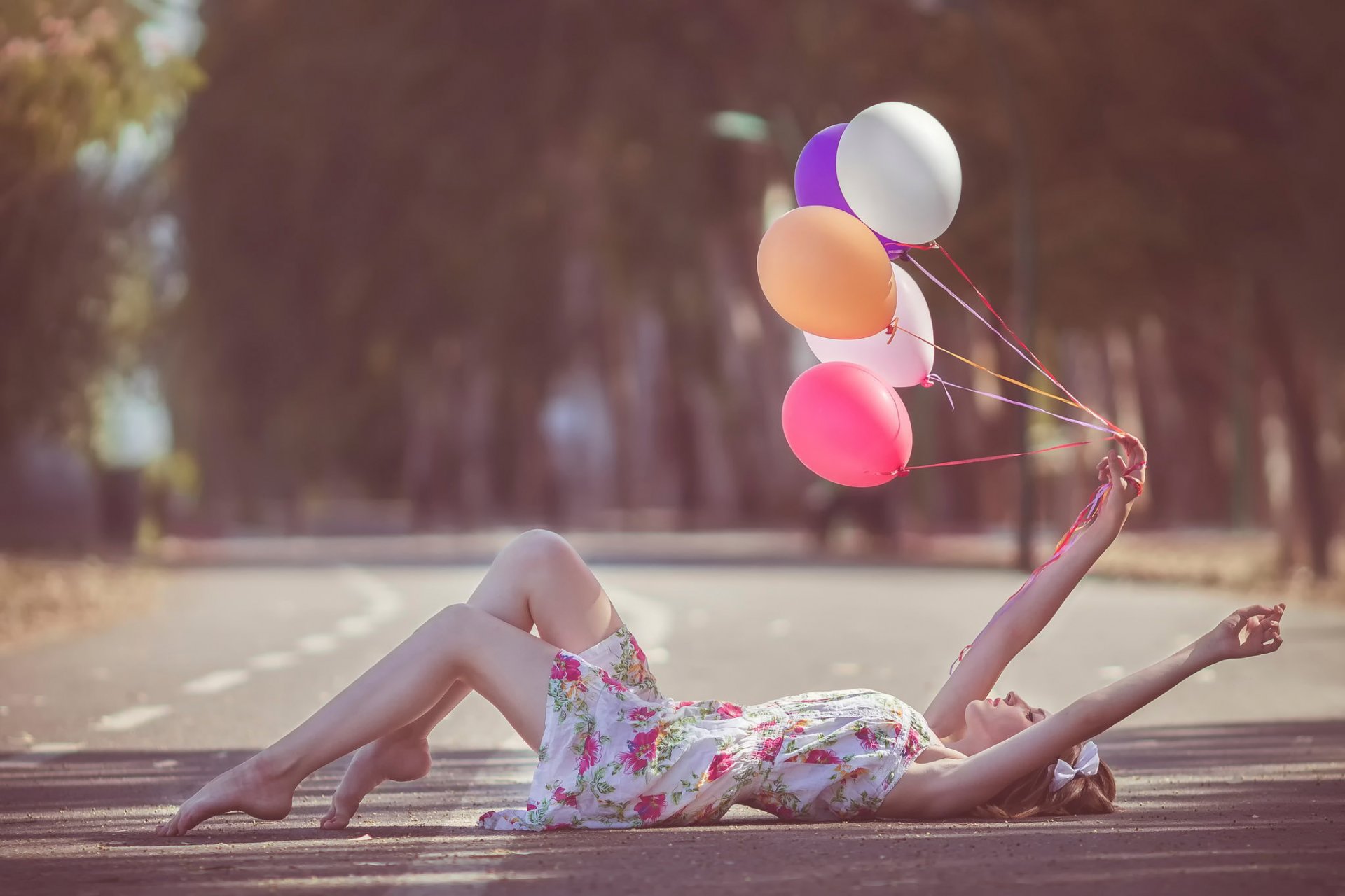 A girl on the road is lying with balloons