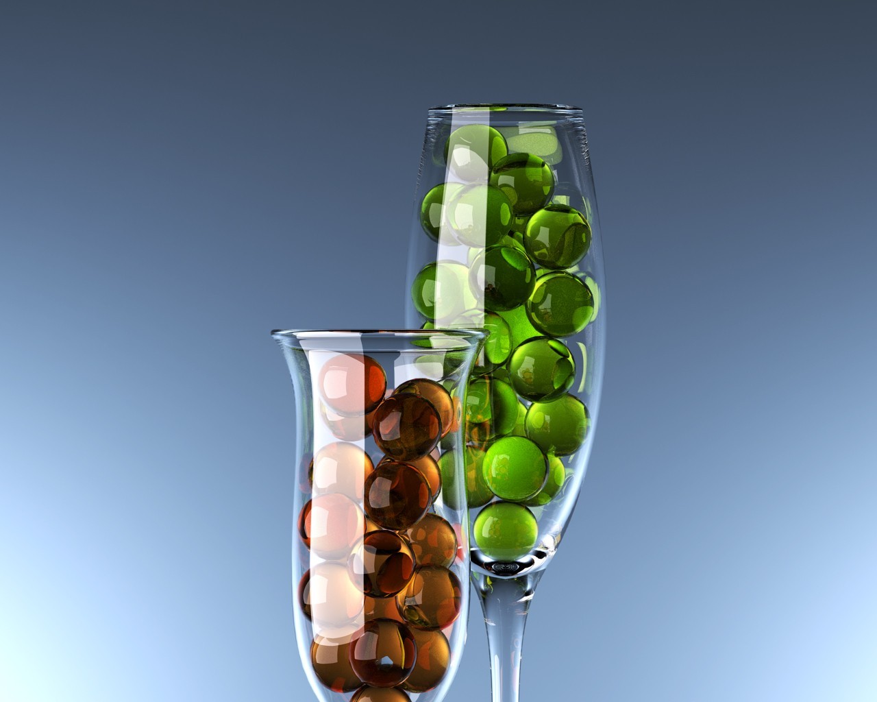 Amber and green glass beads in glasses