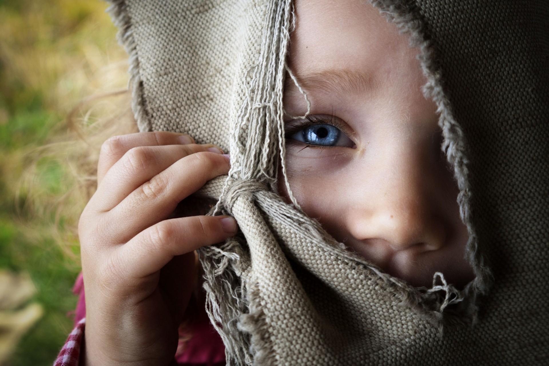 The girl looks through a slit in the burlap