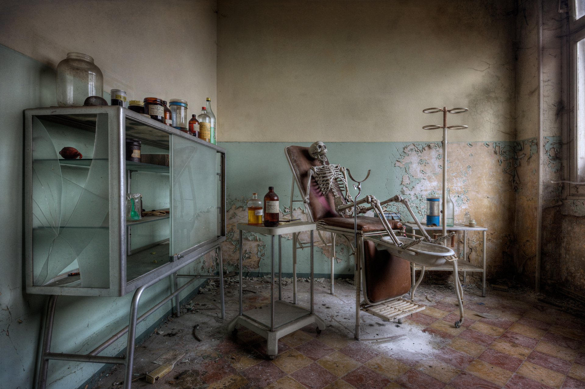 An abandoned medical office with a skeleton