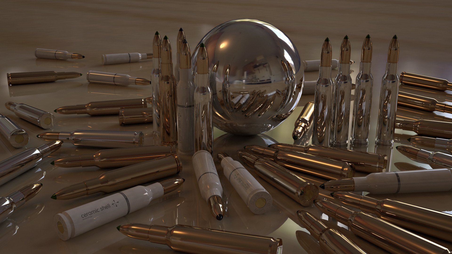 A shiny ball on the background of cartridges
