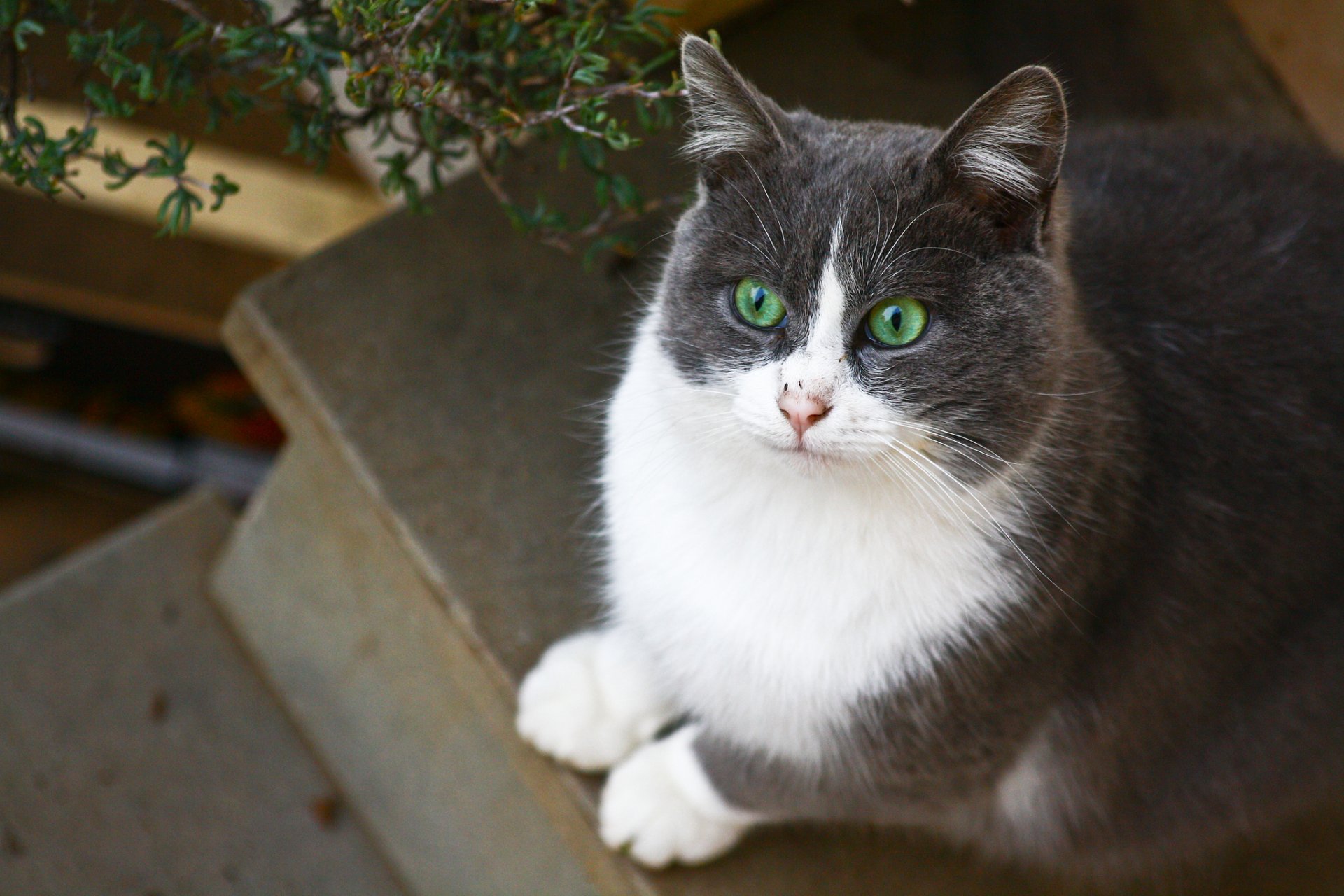 A white and gray cat with green eyes