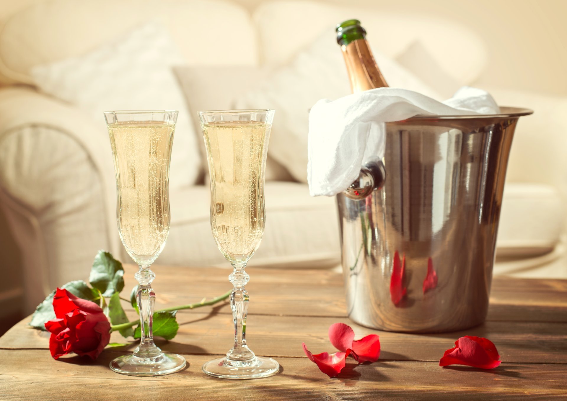 Two glasses and champagne in a bucket on the table
