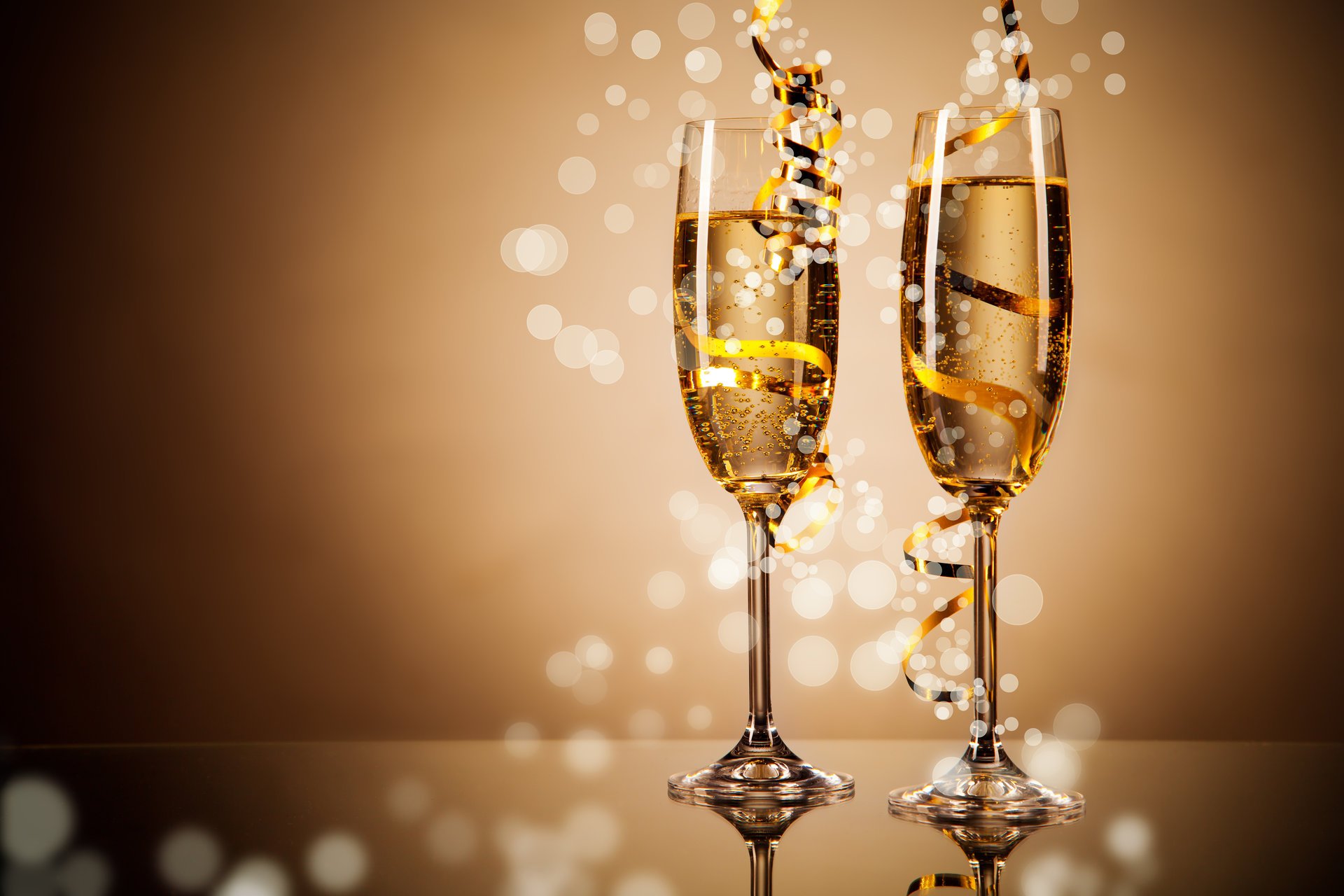 Two glasses of champagne for the new year with a gold ribbon and highlights
