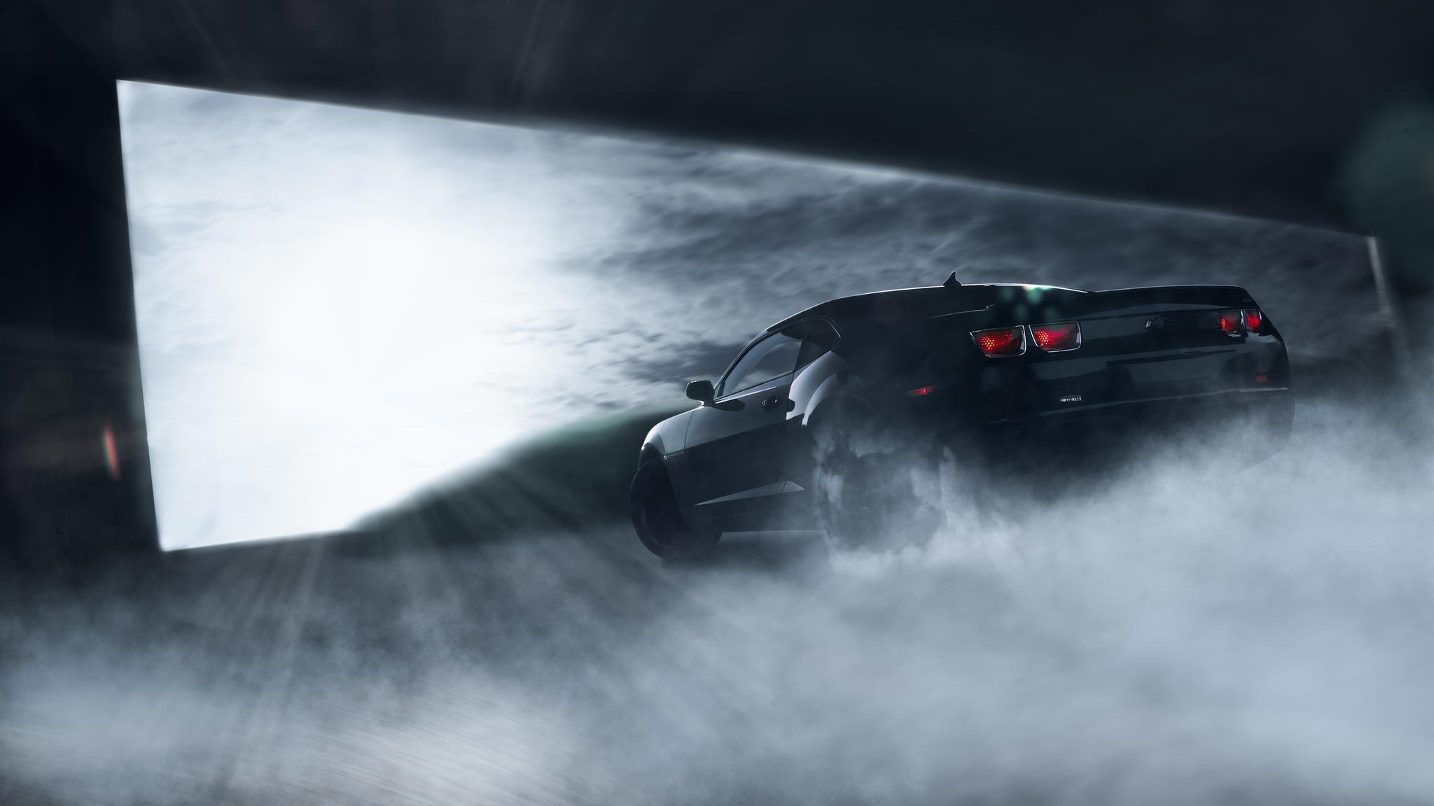 Black chevrolet, camaro, ss in the dark and in smoke rear view