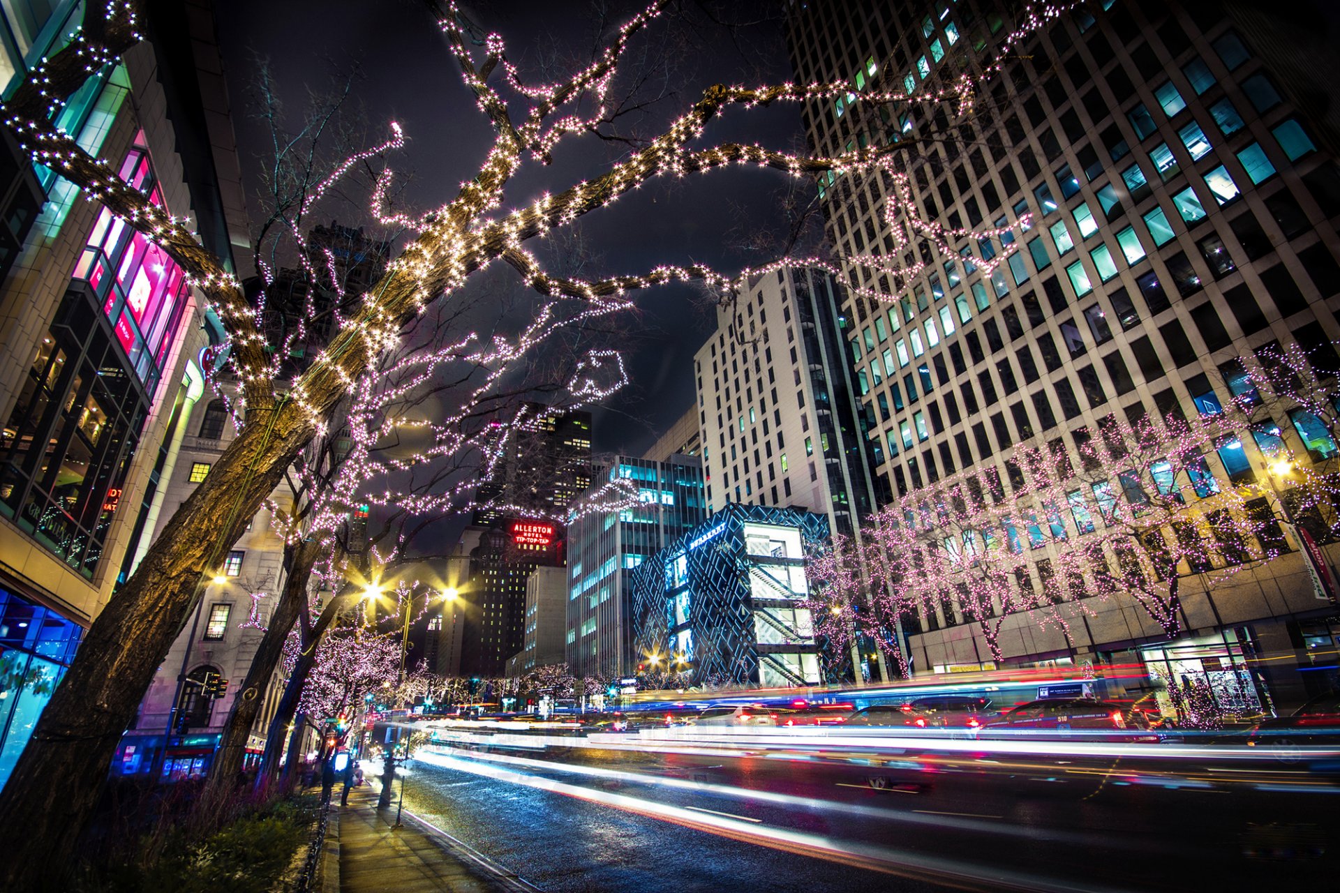 Image tags:chicago, illinois, usa, united states, town, night, road, extract, tree, lights, garland, skyscraper, house, buildings, shops