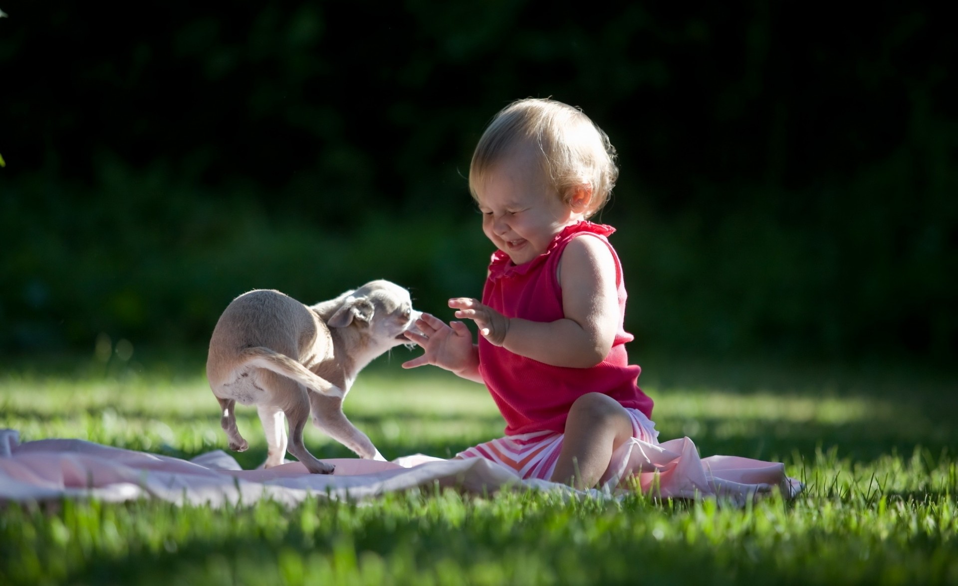 A child plays with a dog