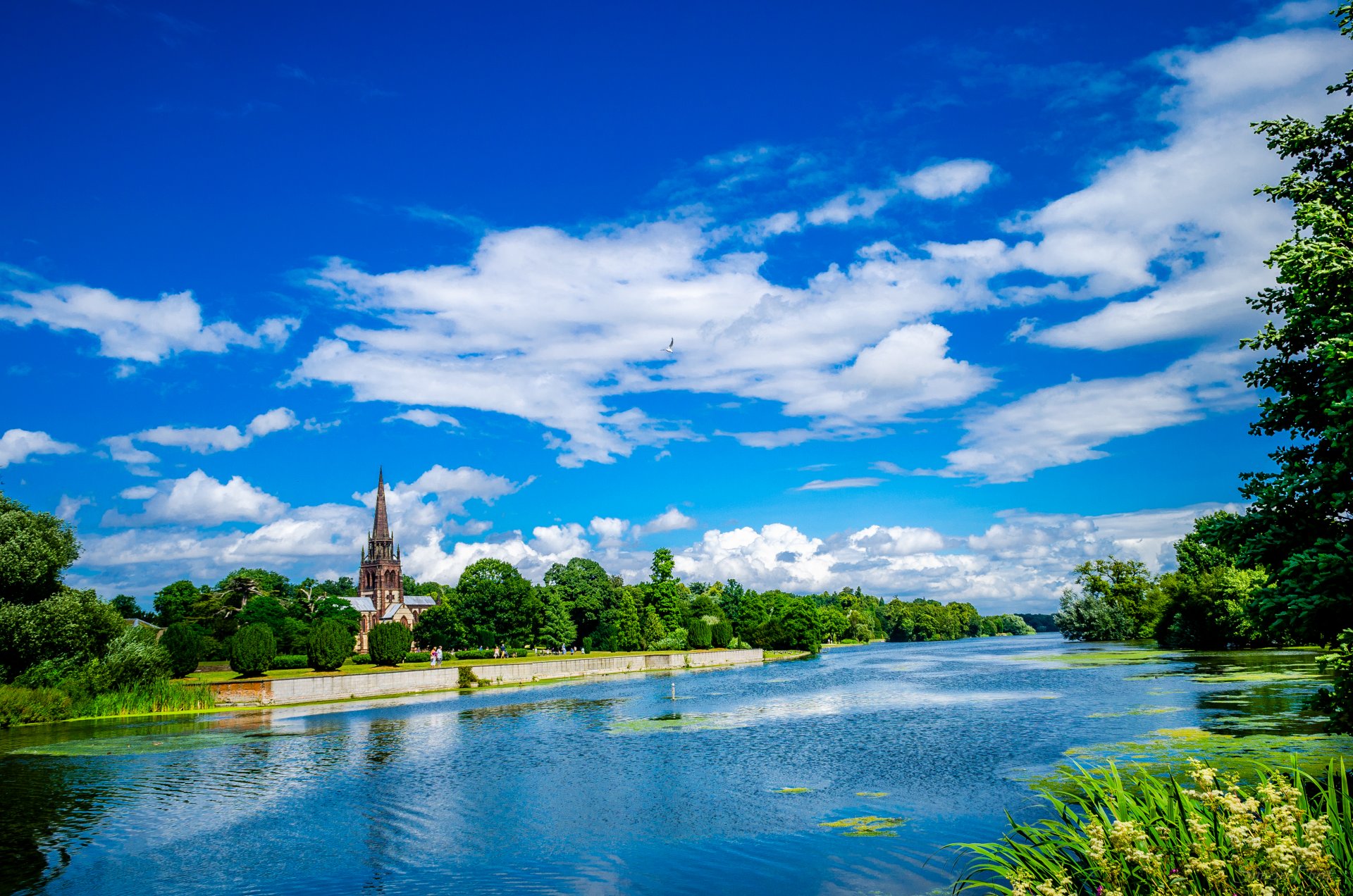 Daytime landscape with church and river