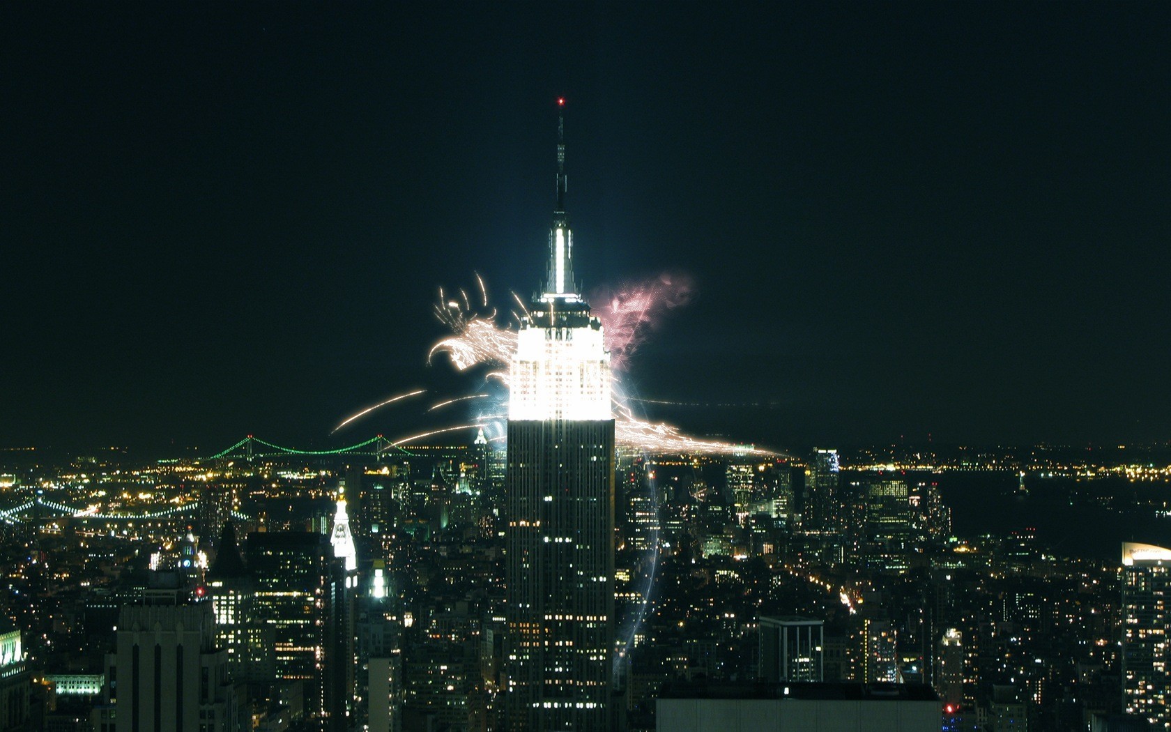 A shot of a beautiful night city with fireworks and lights from houses and cars