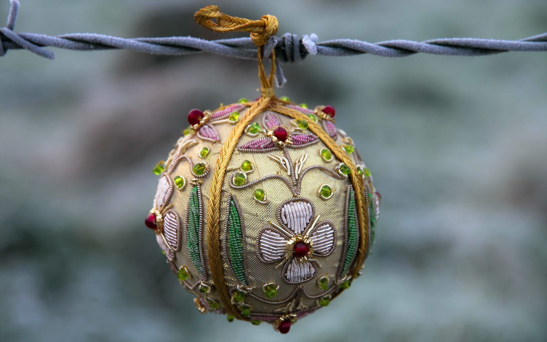 Handmade Christmas tree toy painted with flowers on a blue cord