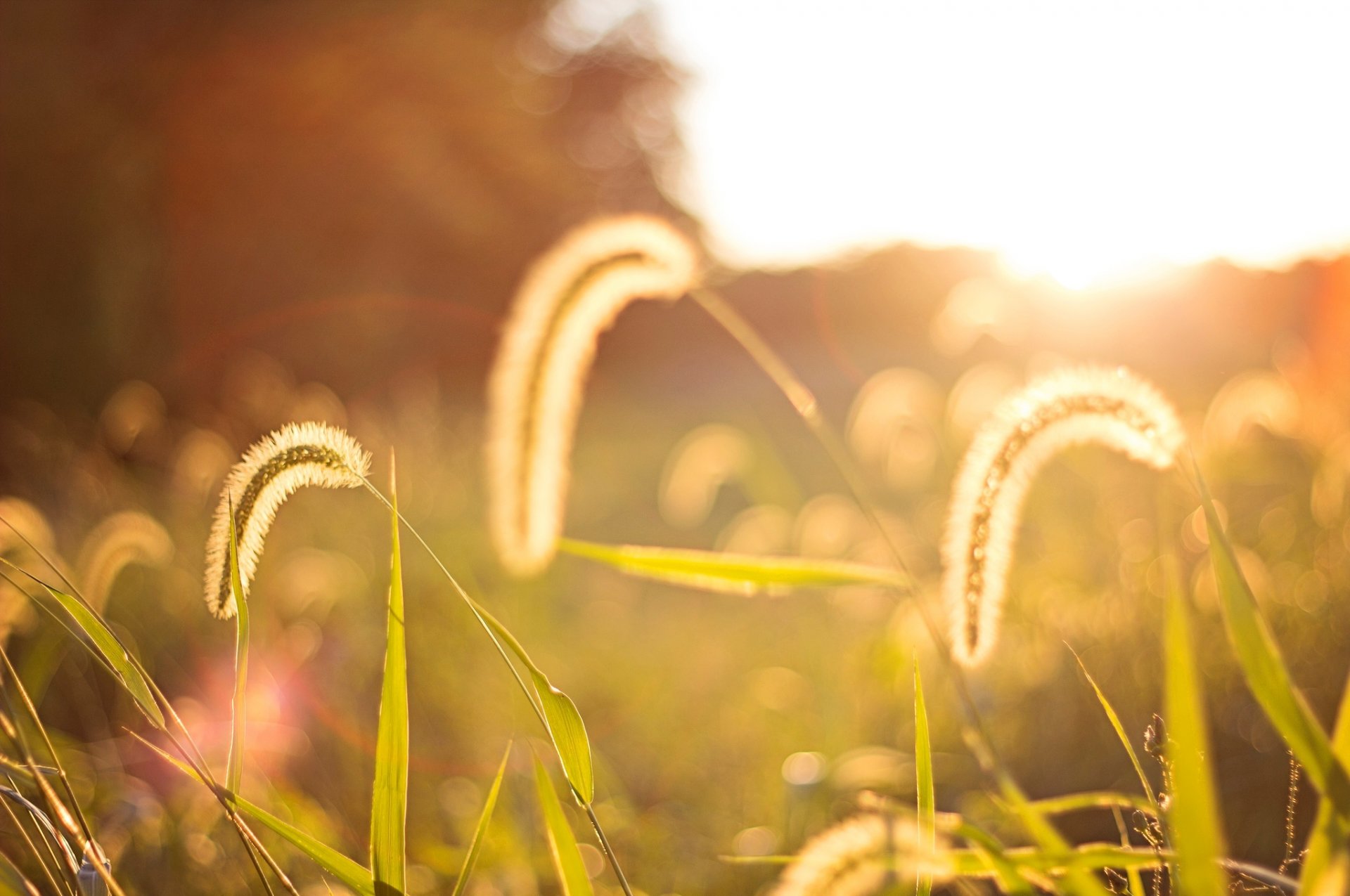Macro summer field with fluffy spikelets under the bright sun