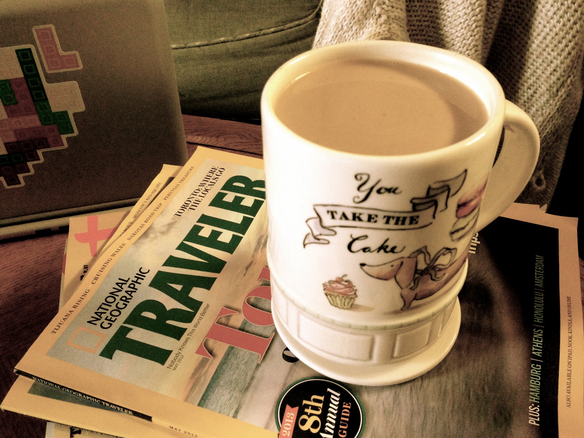A mug of latte is on the magazines