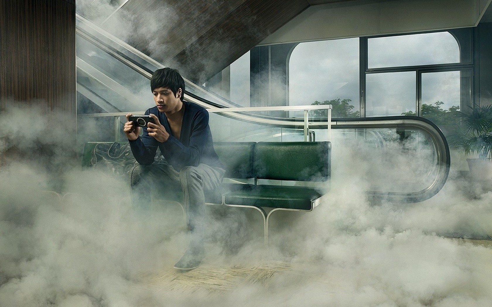 There is fog around and a guy with a psp near the escalator