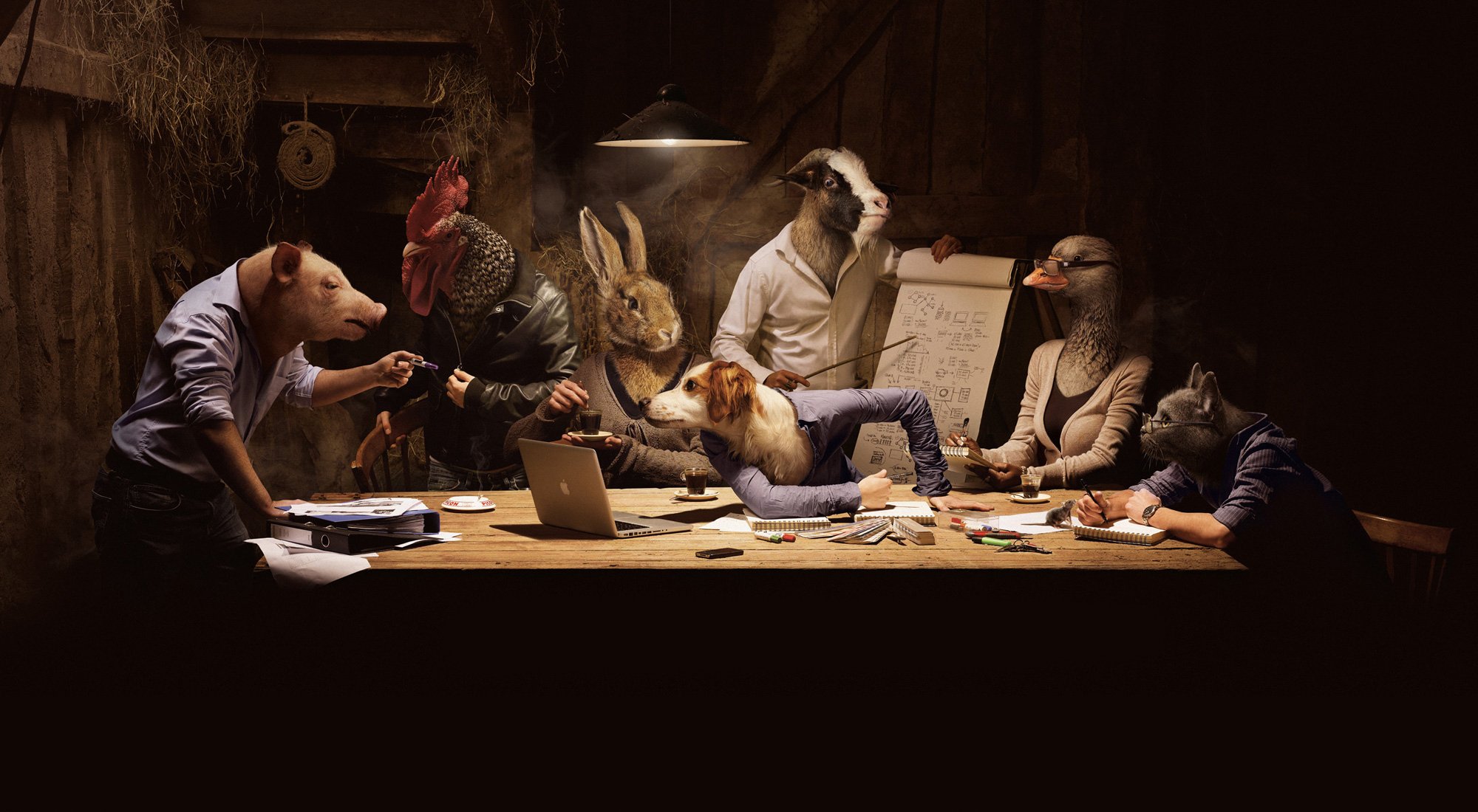 Image tags:creative, the group, pigs, rooster, rabbit, dog, goose, cat, paper, graphics, coffee