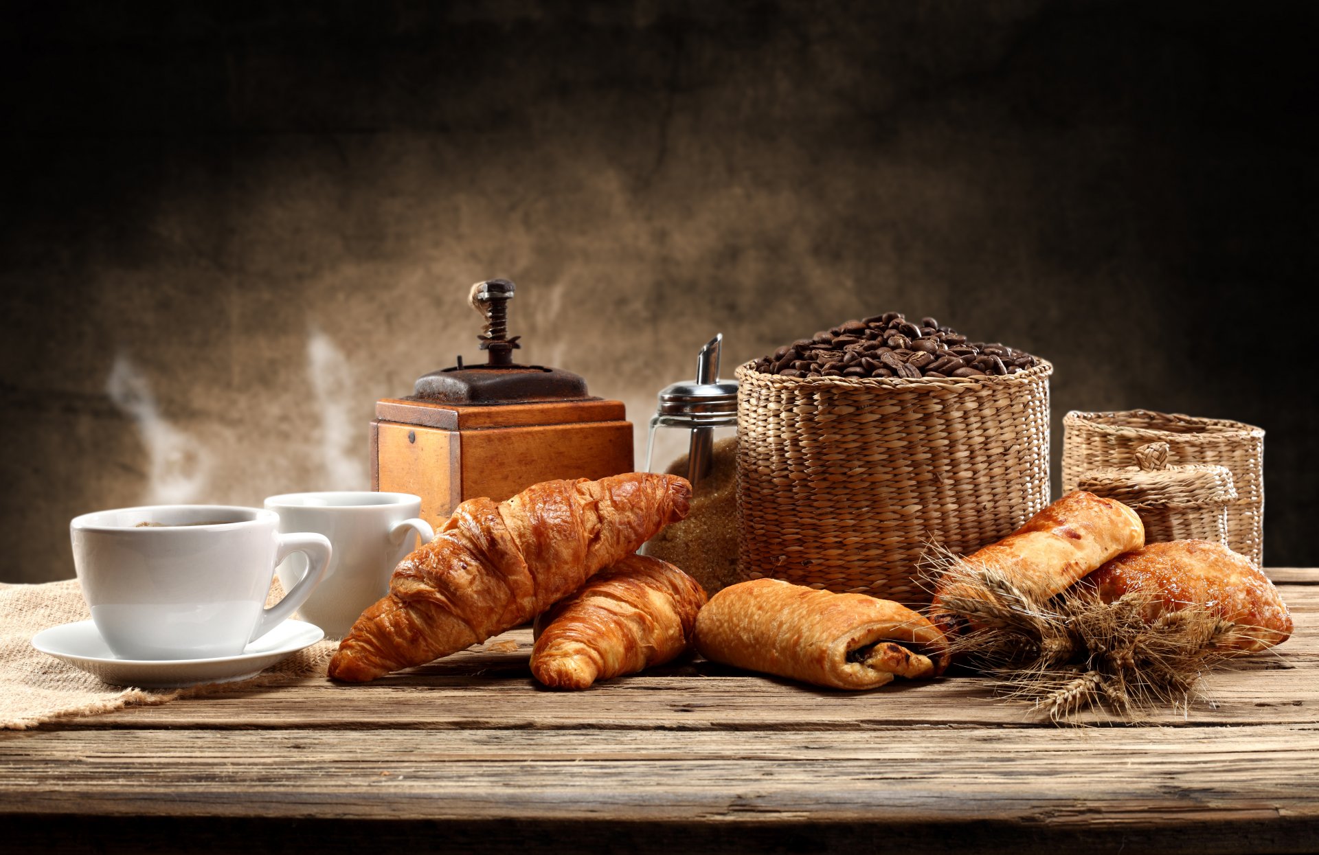 Fresh bread to the table with a cup of coffee made in a coffee grinder