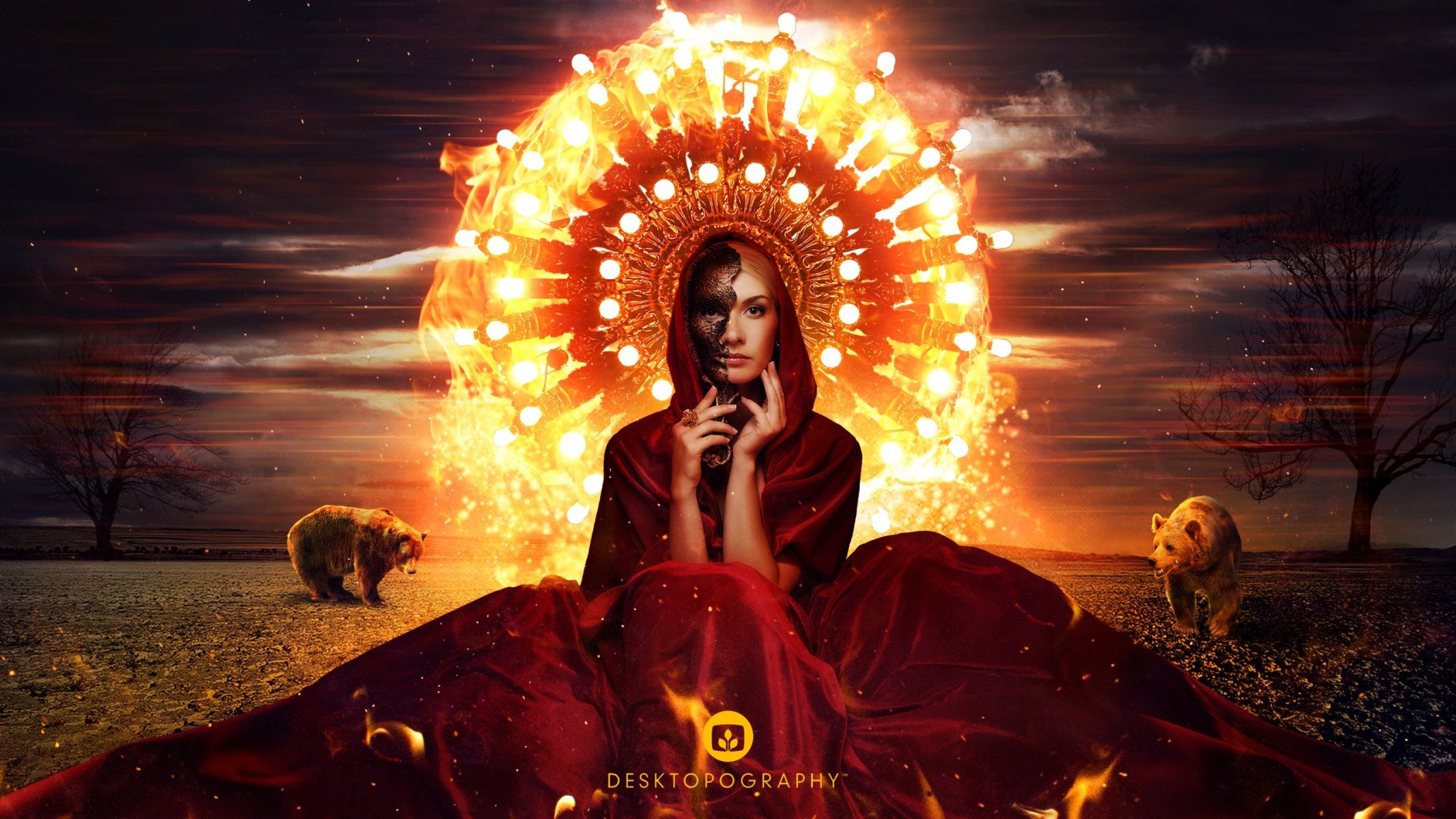 Image tags:desktopography, creative, girl, mask, aura, fire, bears, tree, coat, hood