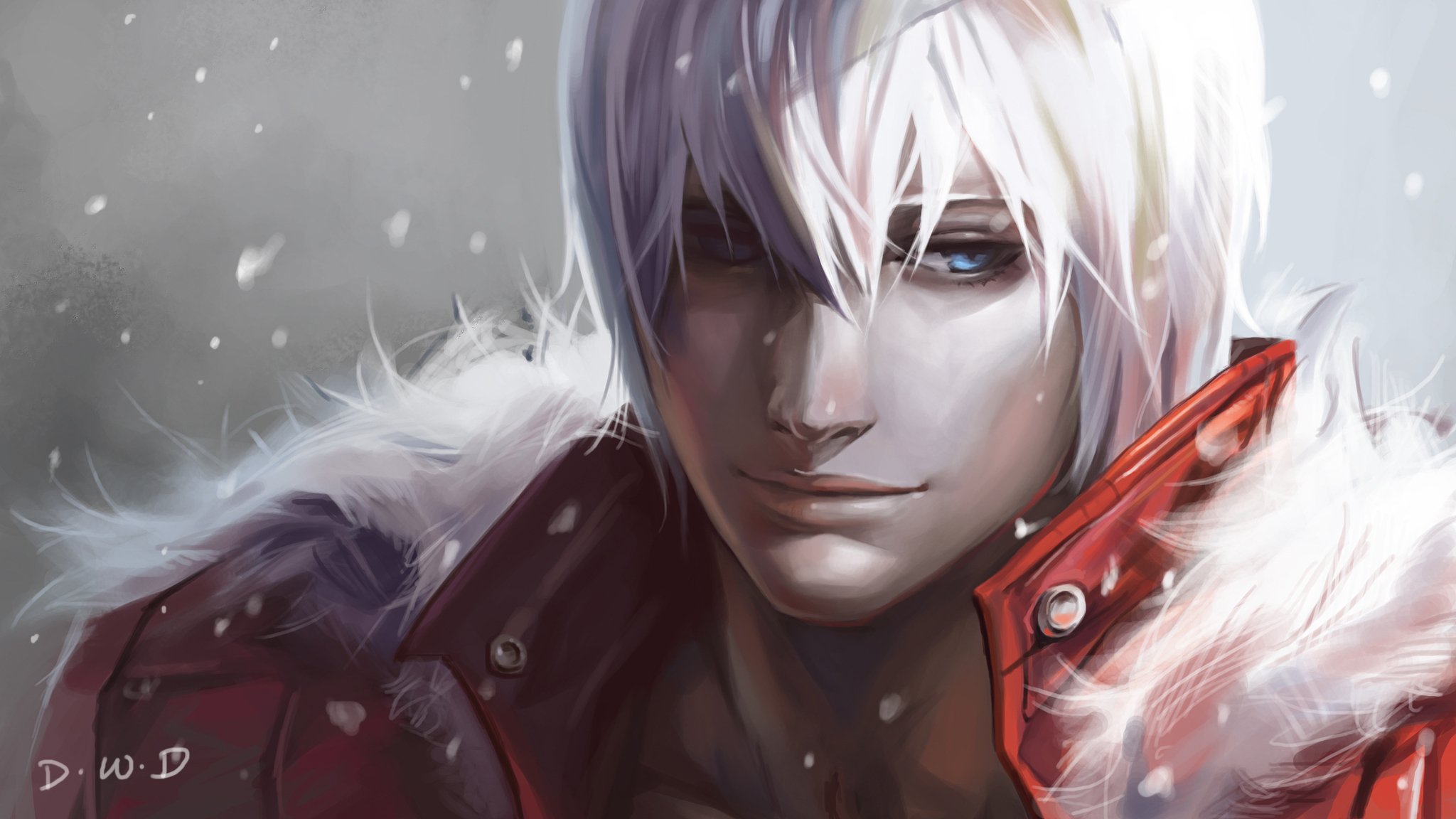 A sad guy is standing in furs under the snow