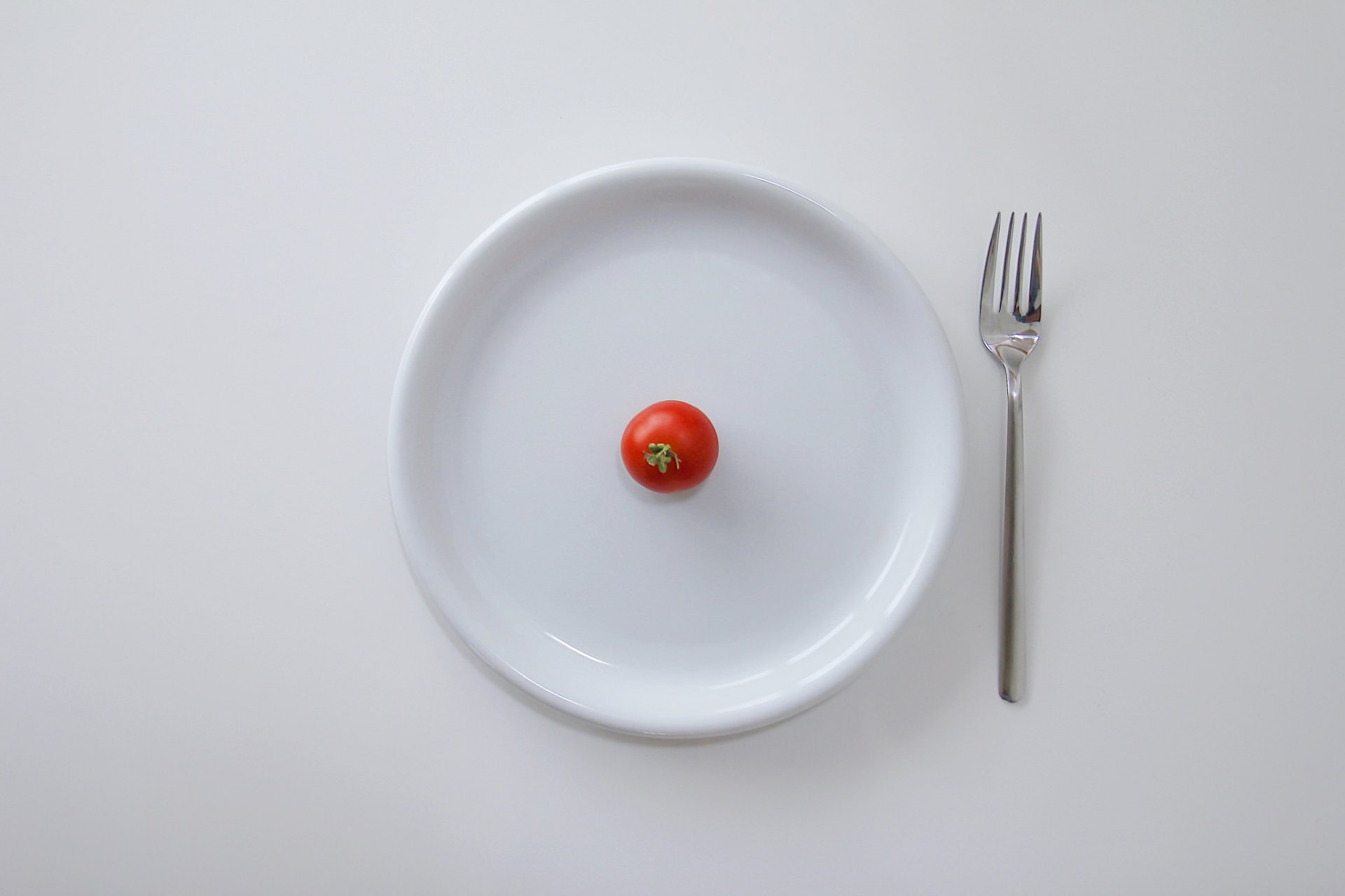 On a white table is a white plate with a cherry tomato and a fork