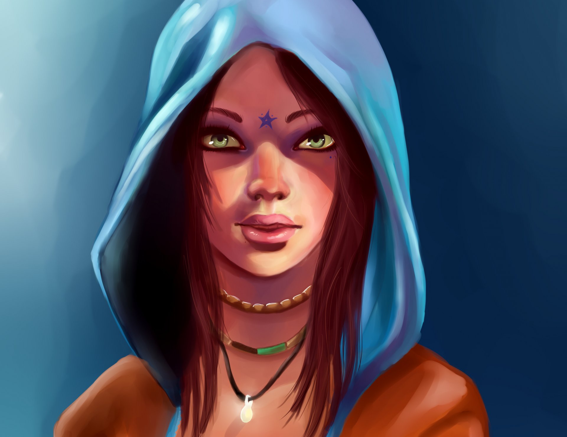A green-eyed girl in a blue hood and a blue star in her forehead