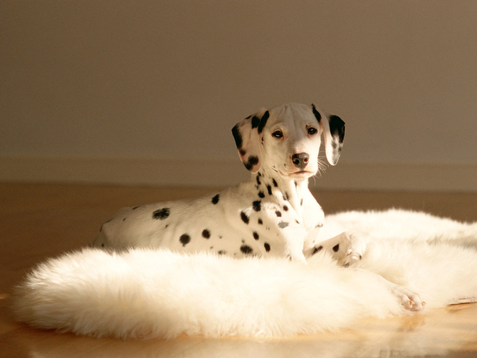 Spotted Dolmatian Great Dane lies on a white fluffy carpet in the living room
