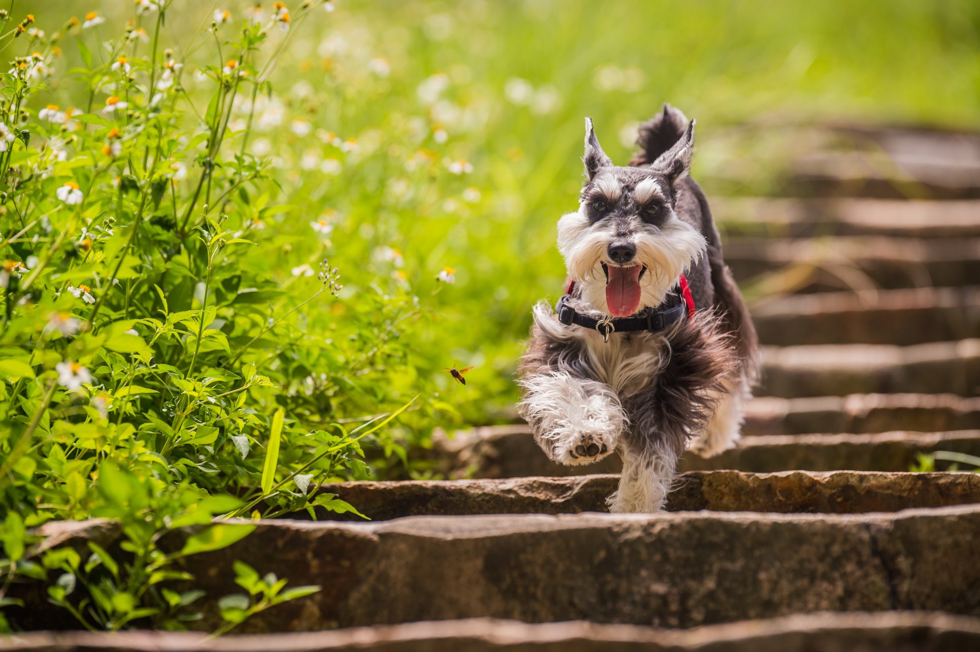 The dog runs along the path among the grass