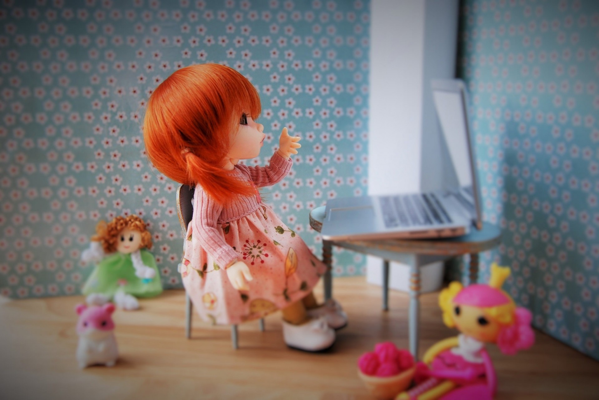 A doll in a pink dress. A composition of dolls. A doll behind a laptop. A doll with fiery hair and her friends