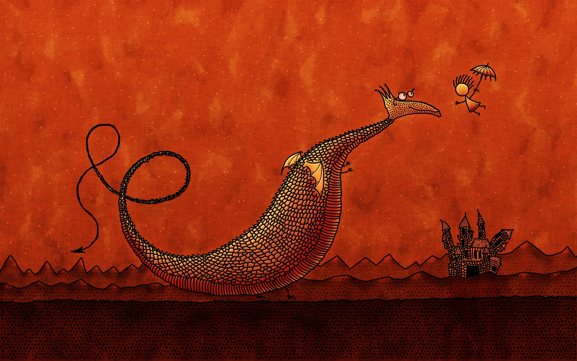 The dragon looks at the man with the umbrella